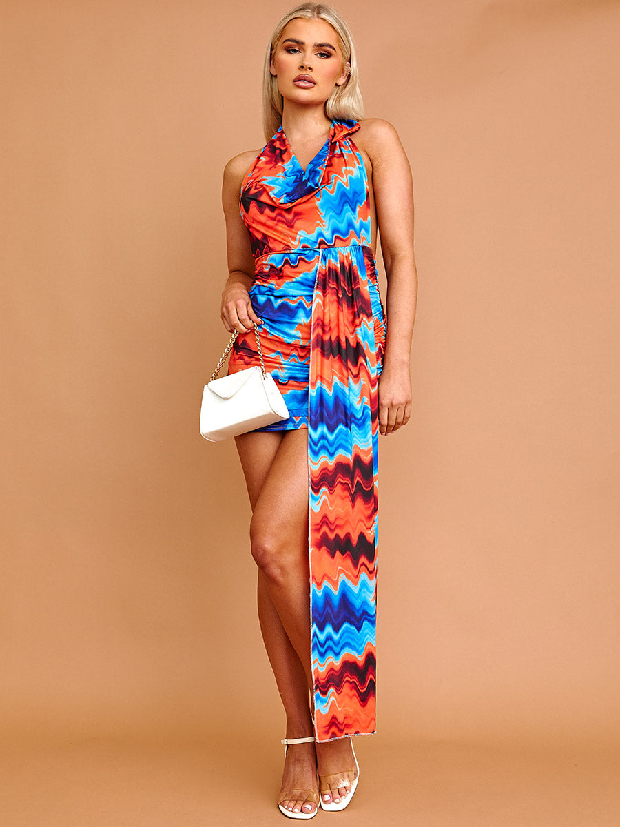 Gedruckter Neckholder -Halshals -Kleid mit langen Drapeln