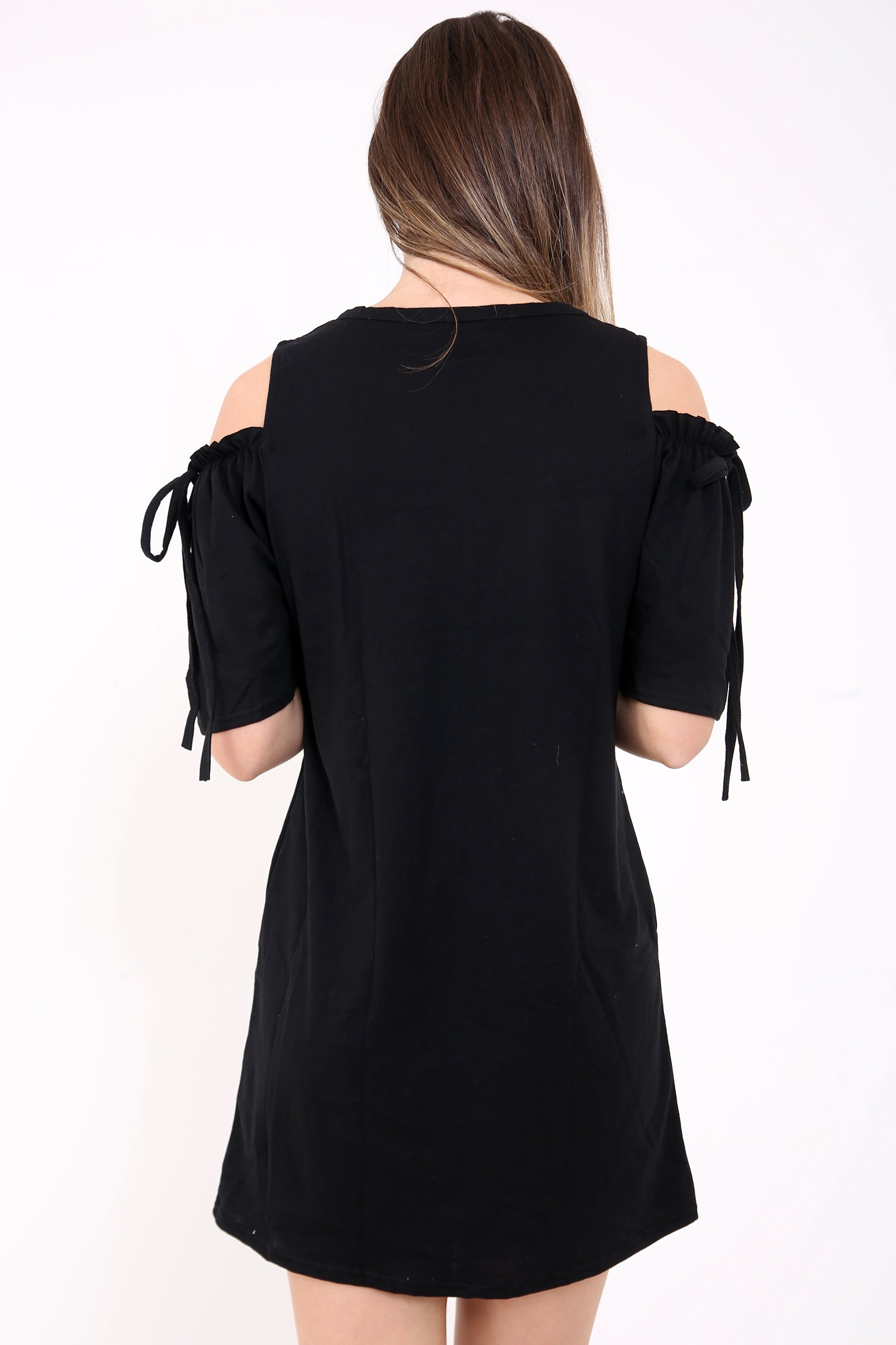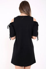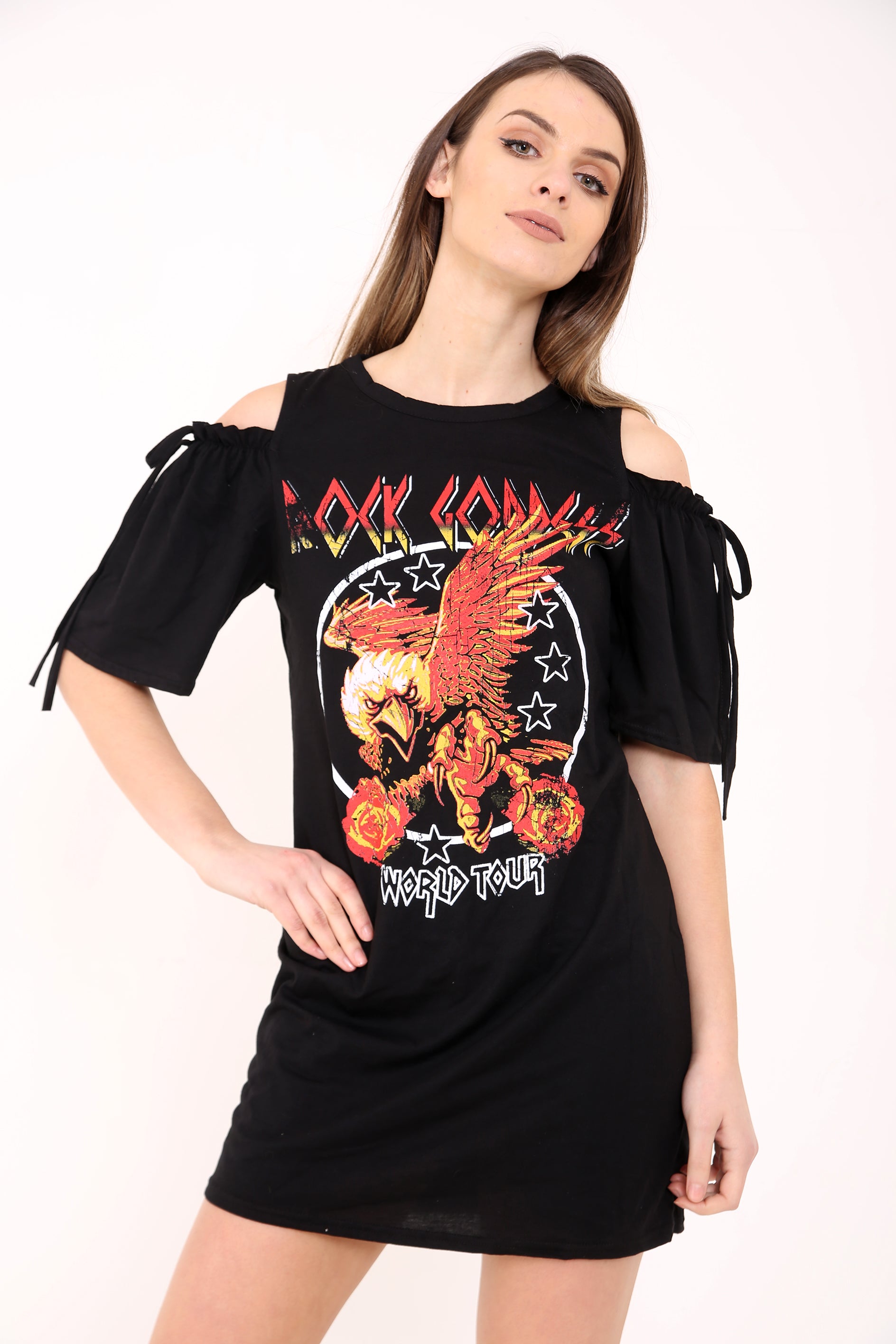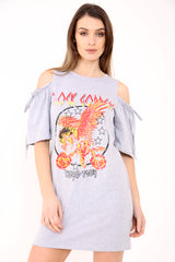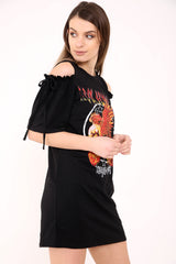 Kalte Schultergesteinsgöttin gedrucktes Mini -Kleid