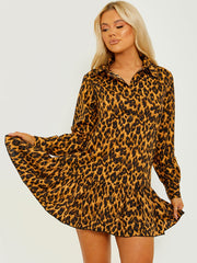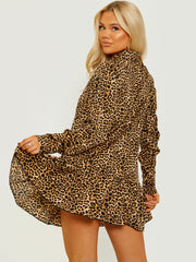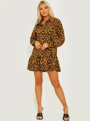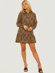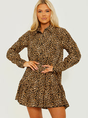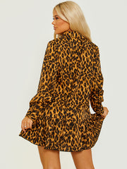Leopardendrucken Frill Saum geknöpfte Hemdkleid