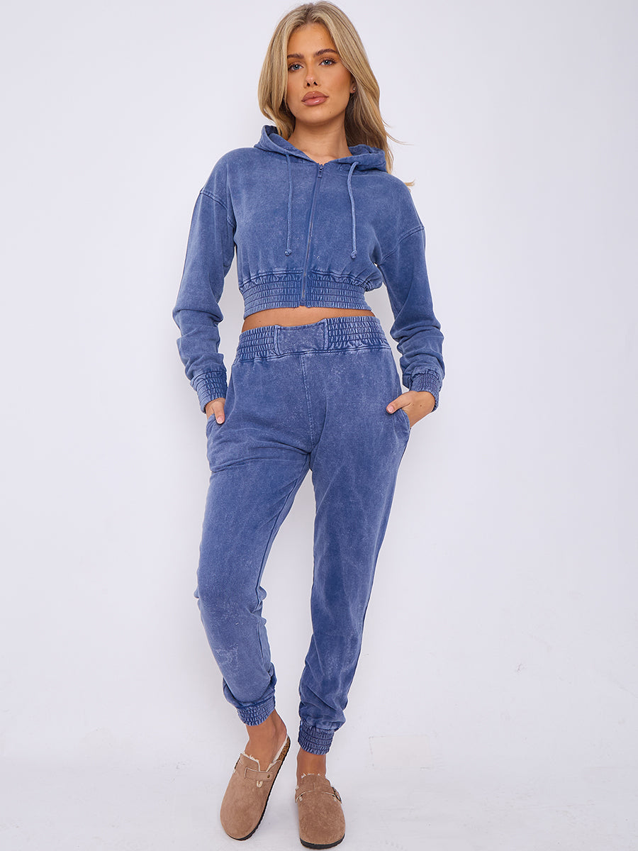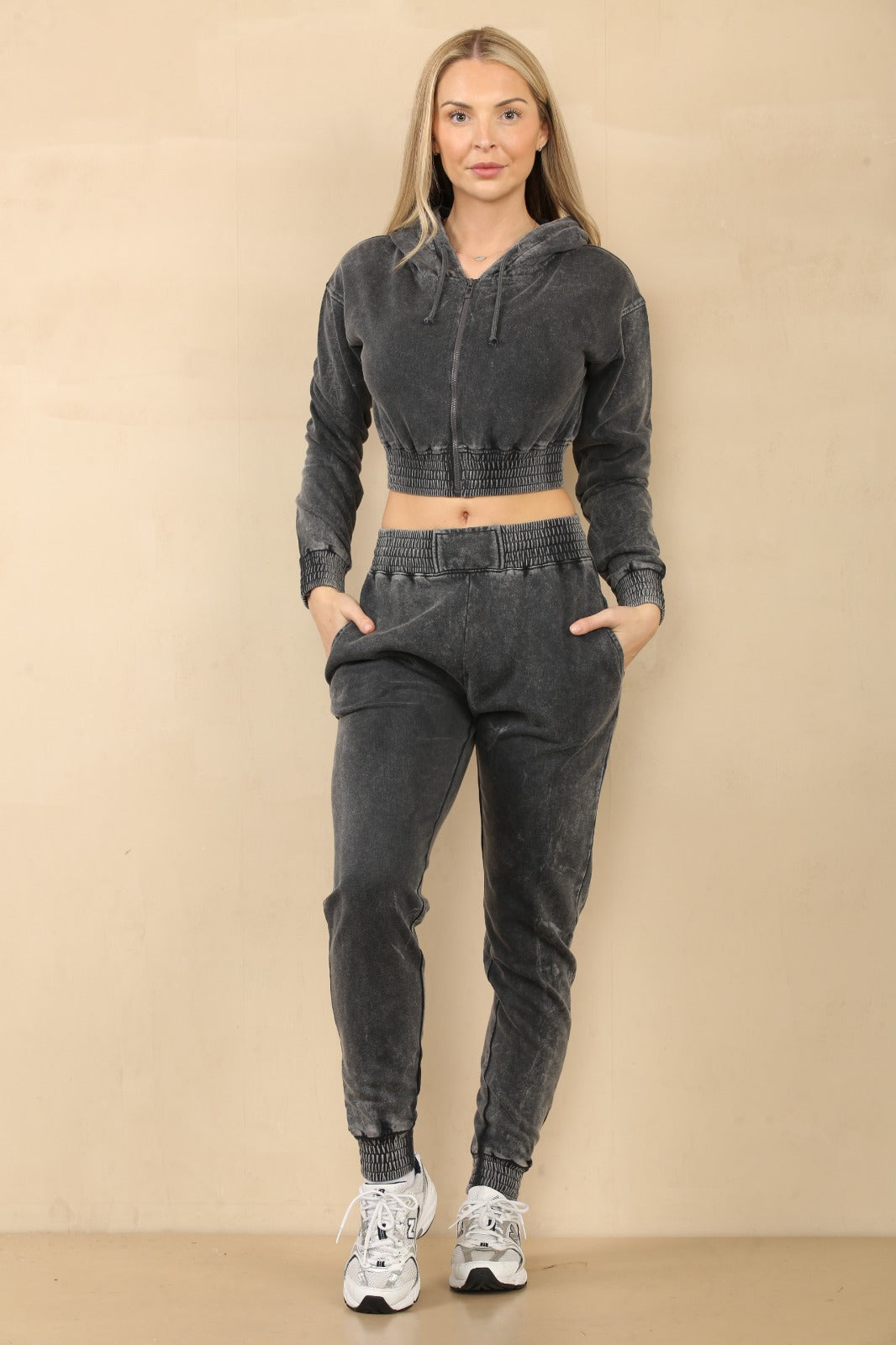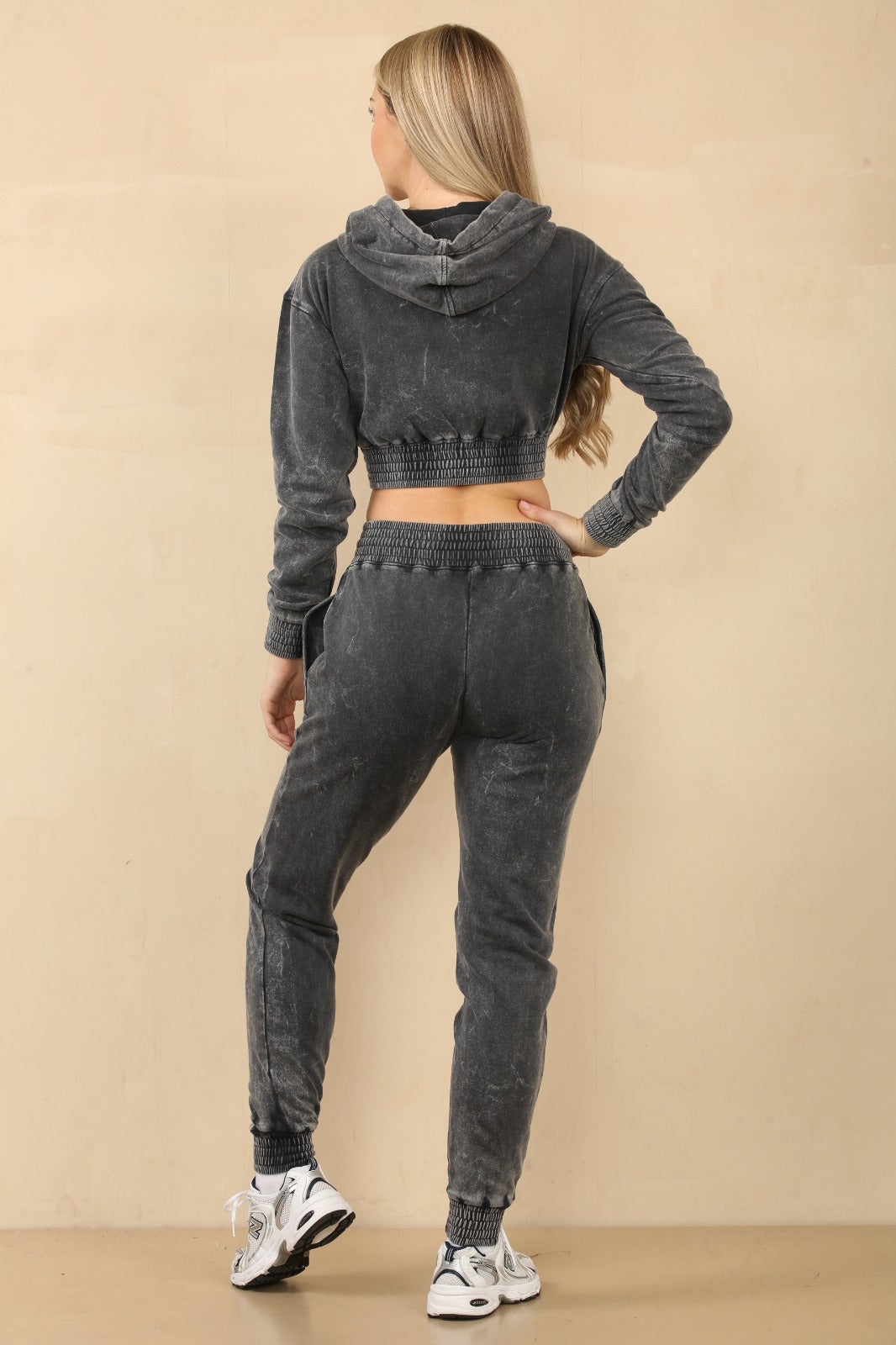 Acid Wash Zip Up Cropped Hoodie & Jogger Fleece Tracksuit