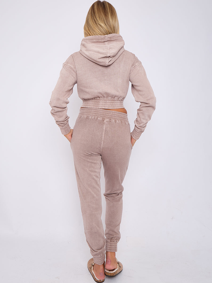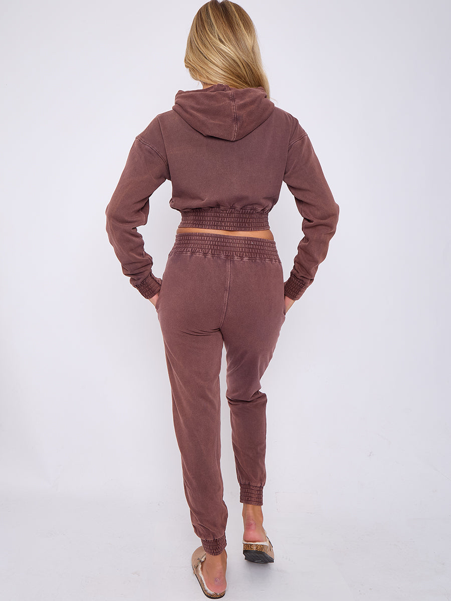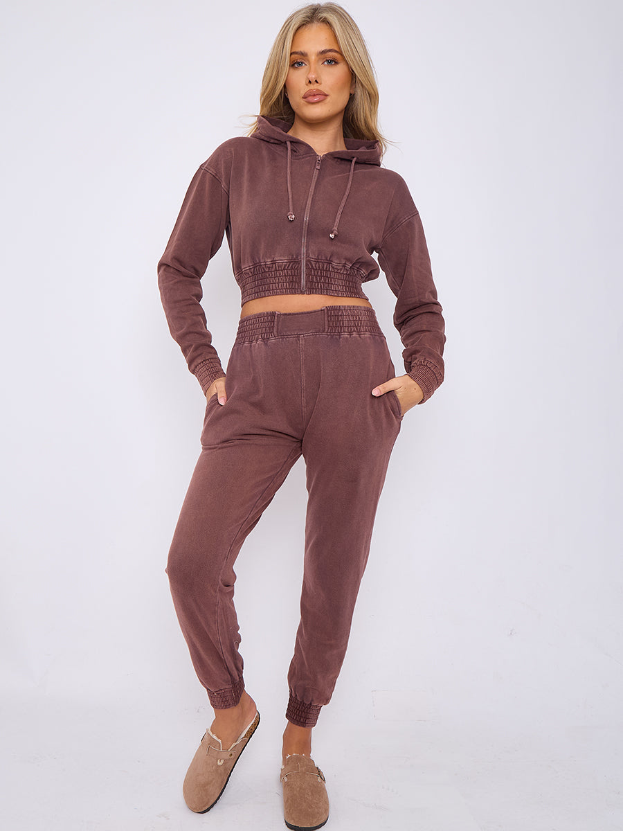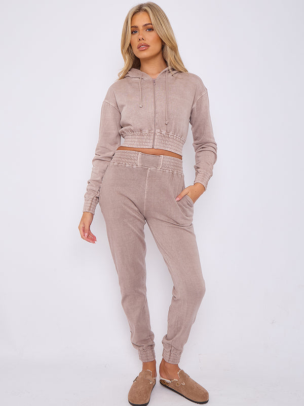 Acid Wash Zip Up Cropped Hoodie & Jogger Fleece Tracksuit