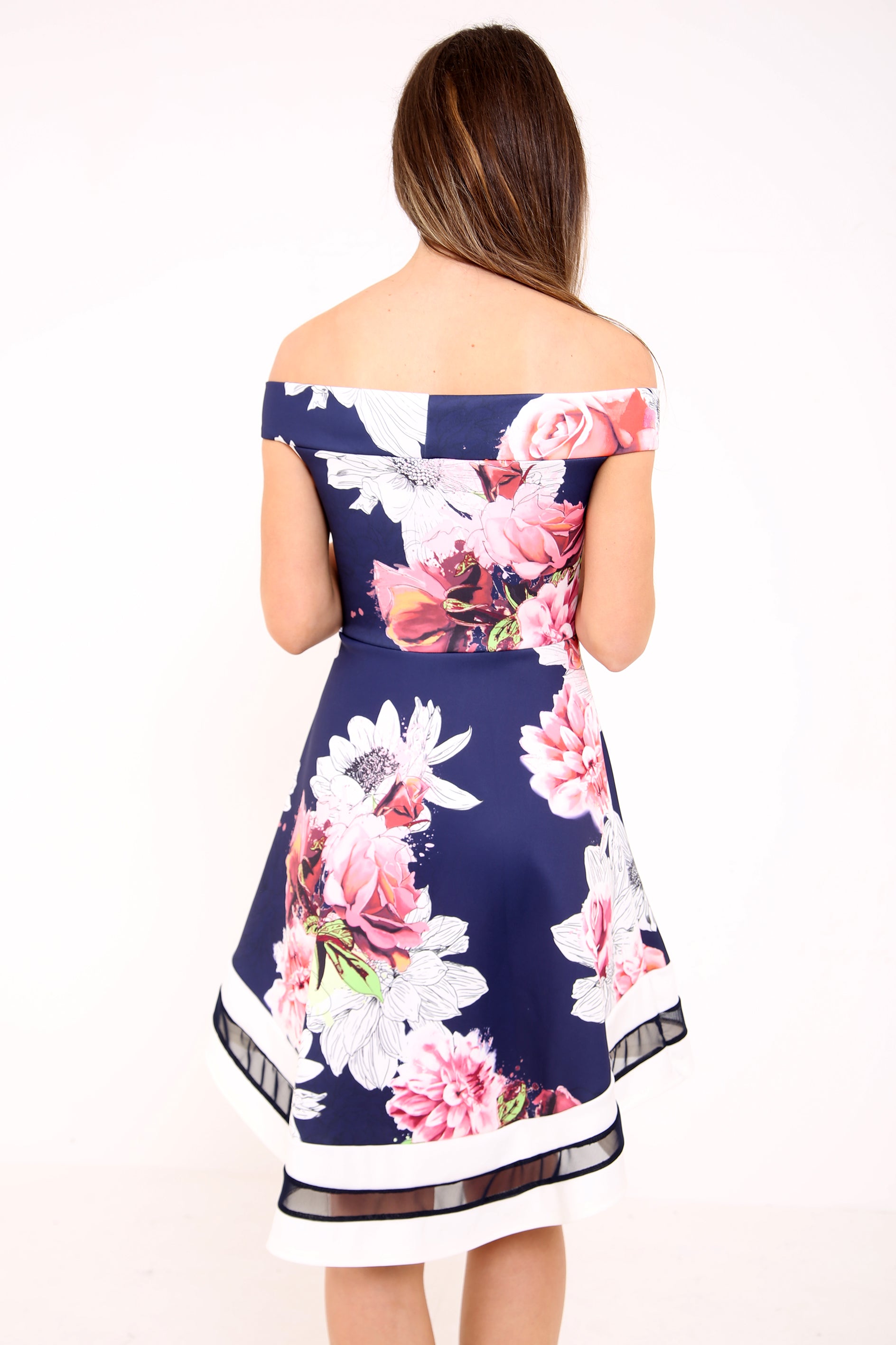 Rose Floral Mesh Insert Bardot Skater Dress
