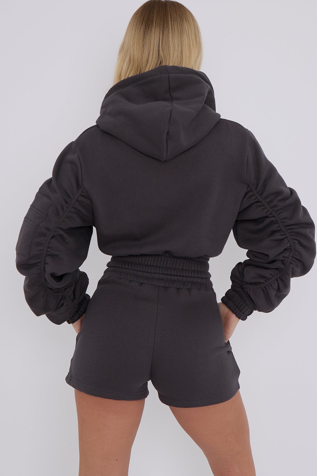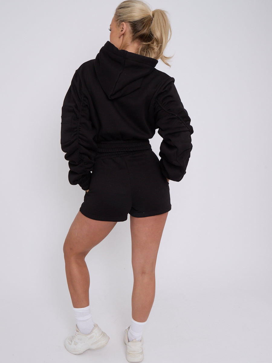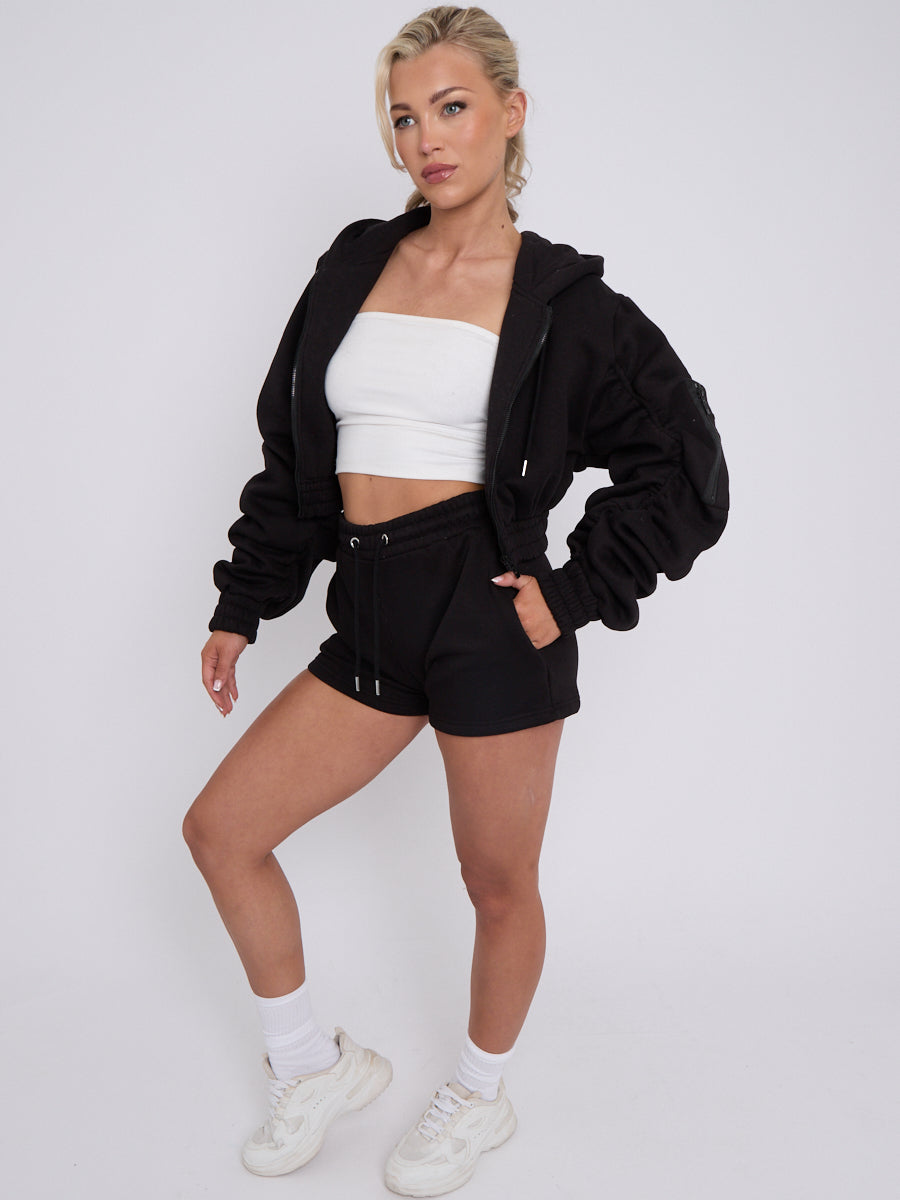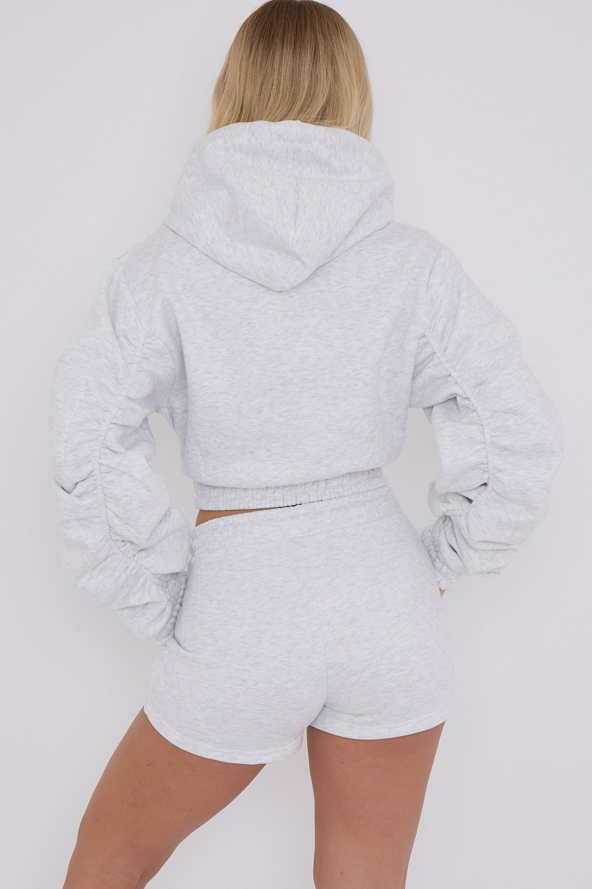 Cropped Zip Up Ruched Sleeve Hoodie & Shorts Fleece Co-ord