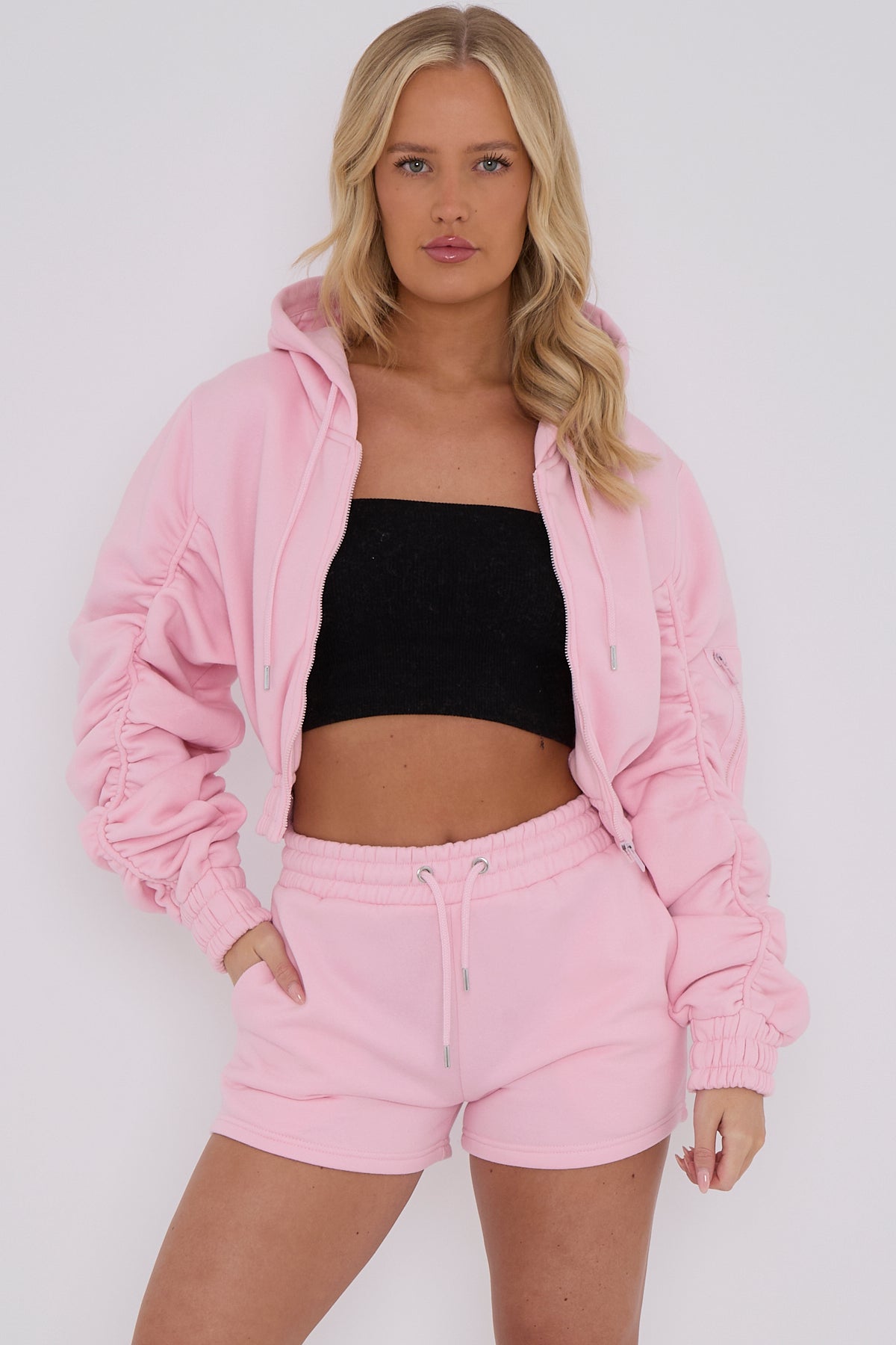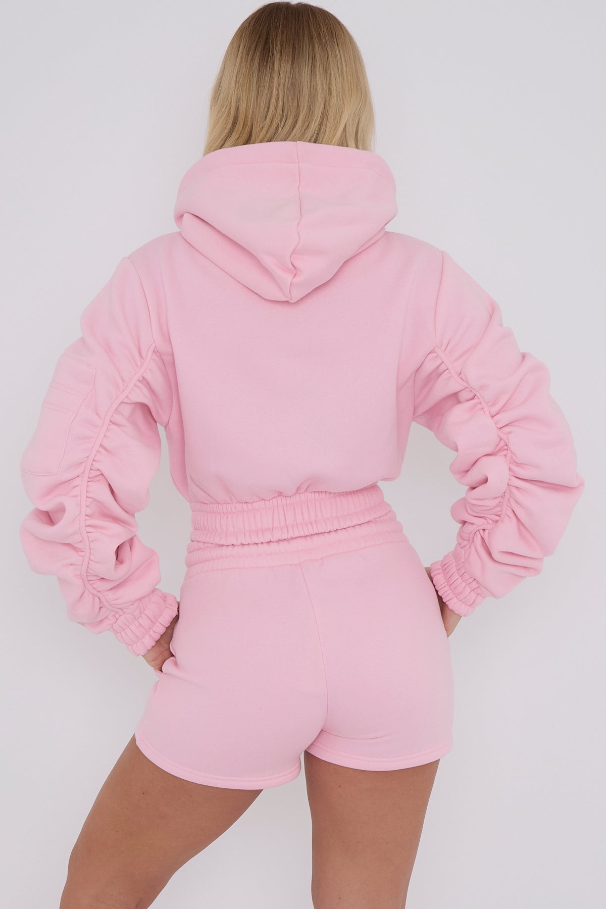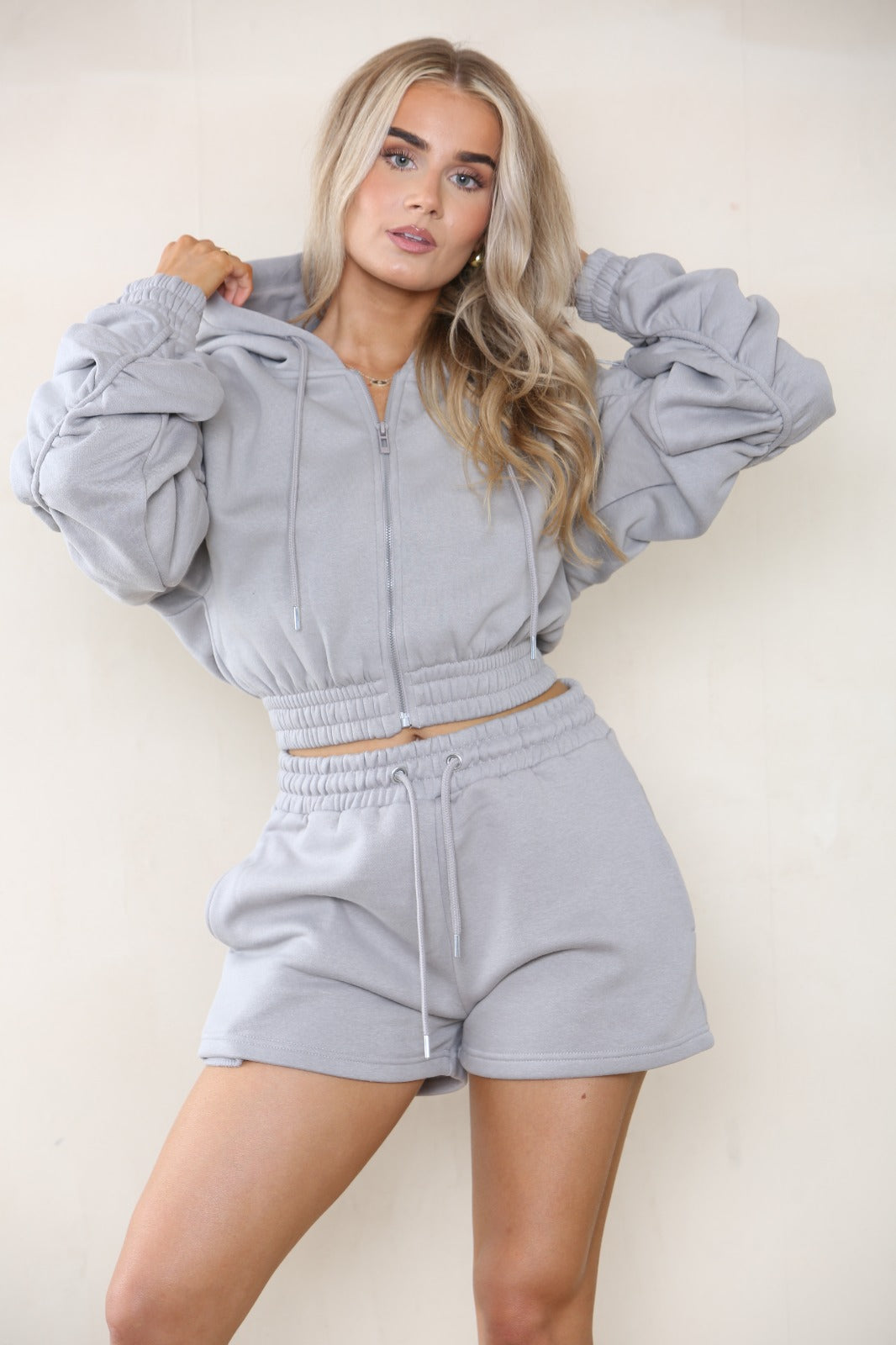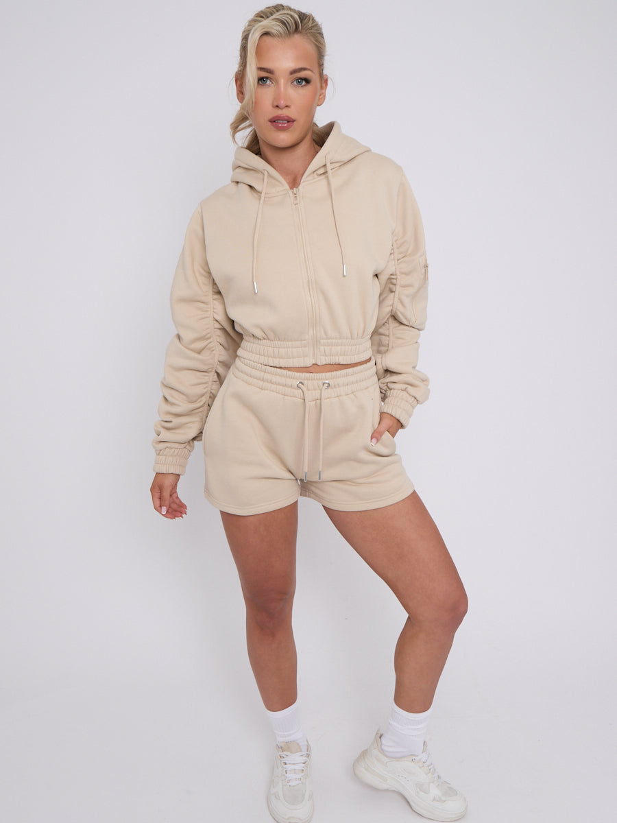 Cropped Zip Up Ruched Sleeve Hoodie & Shorts Fleece Co-ord