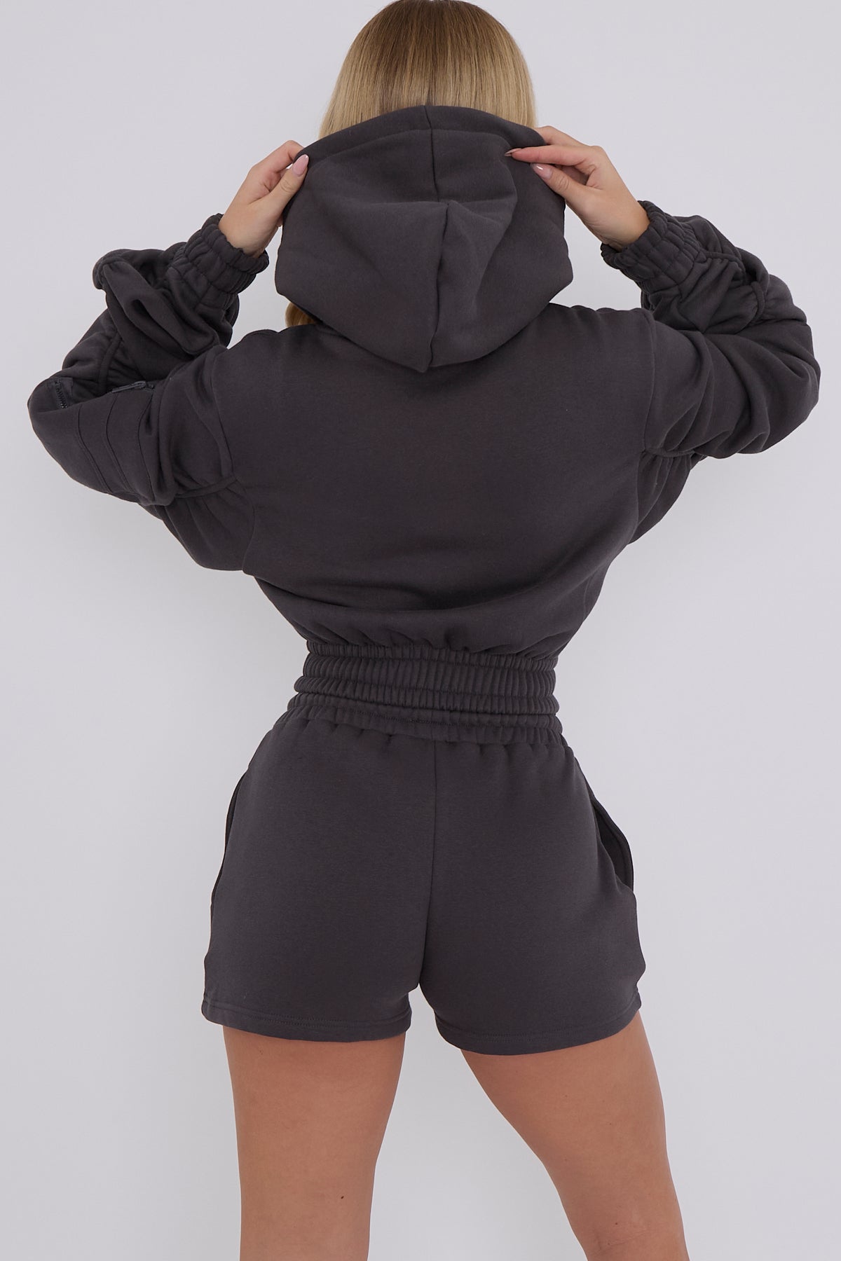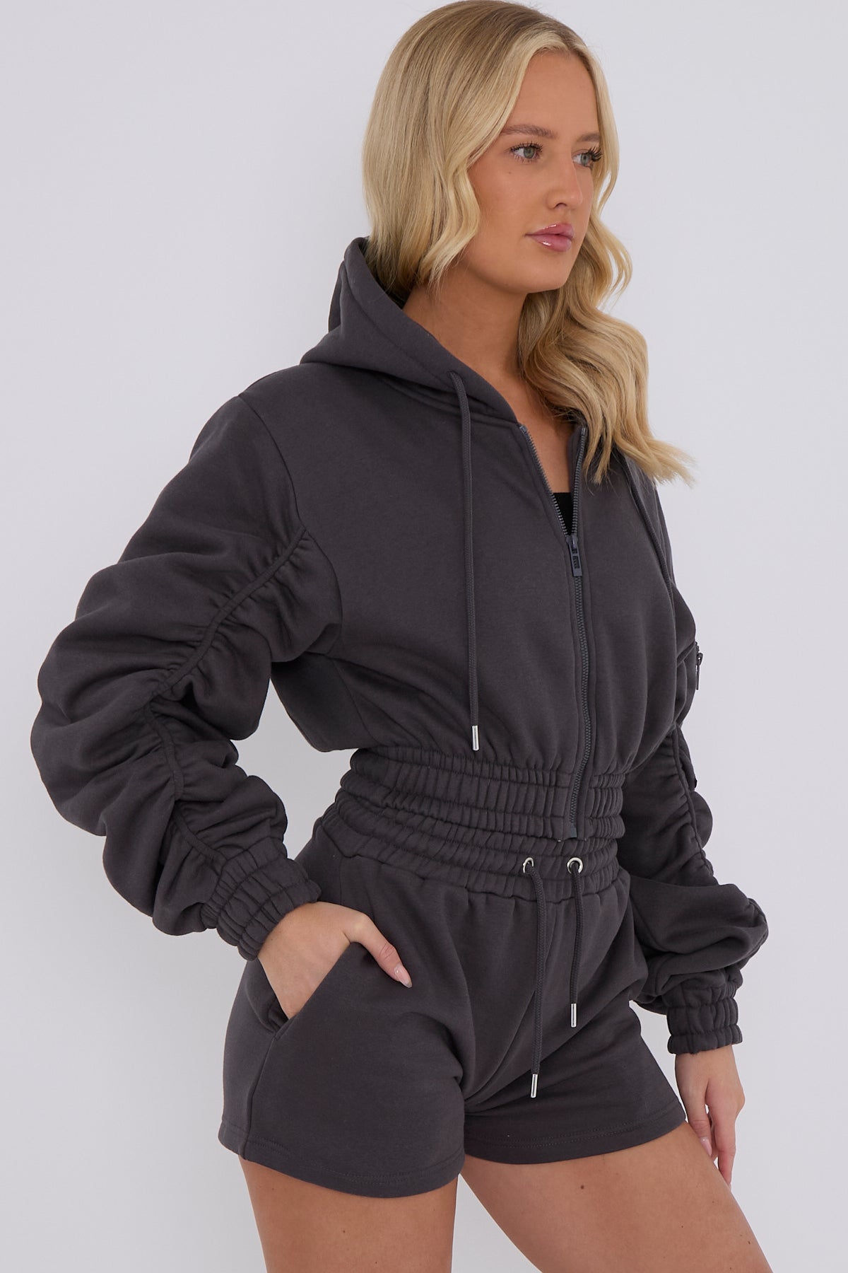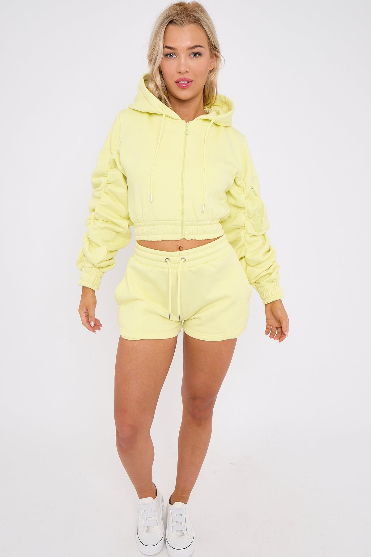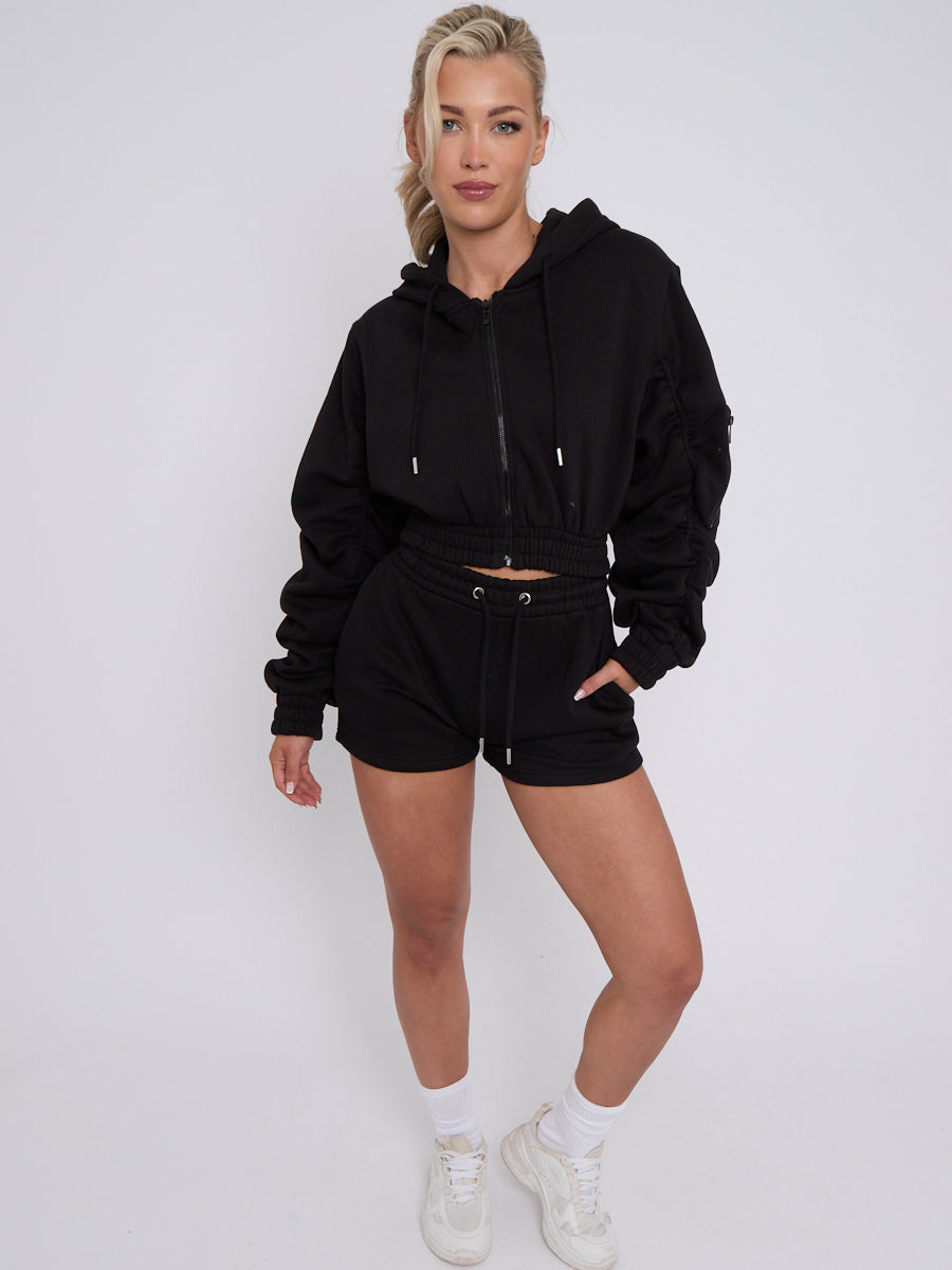 Cropped Zip Up Ruched Sleeve Hoodie & Shorts Fleece Co-ord