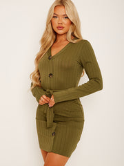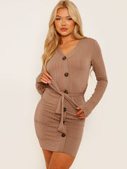 Mock Button Detail Ribbed Belted Dress