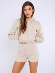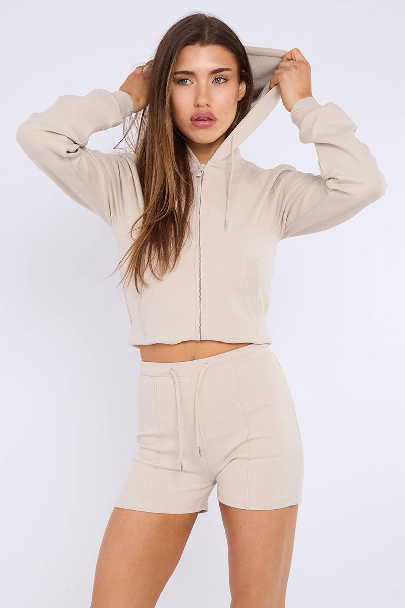 Zipped Hooded Crop Top & Seam Detail Shorts Fleece Co-ord