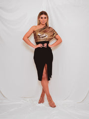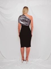 Detalle de papel de aluminio Vestido frontal de envoltura de un hombro