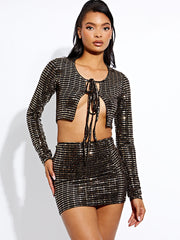 Top de cosecha de nudos de ida de lentejuelas y mini falda coordenada