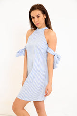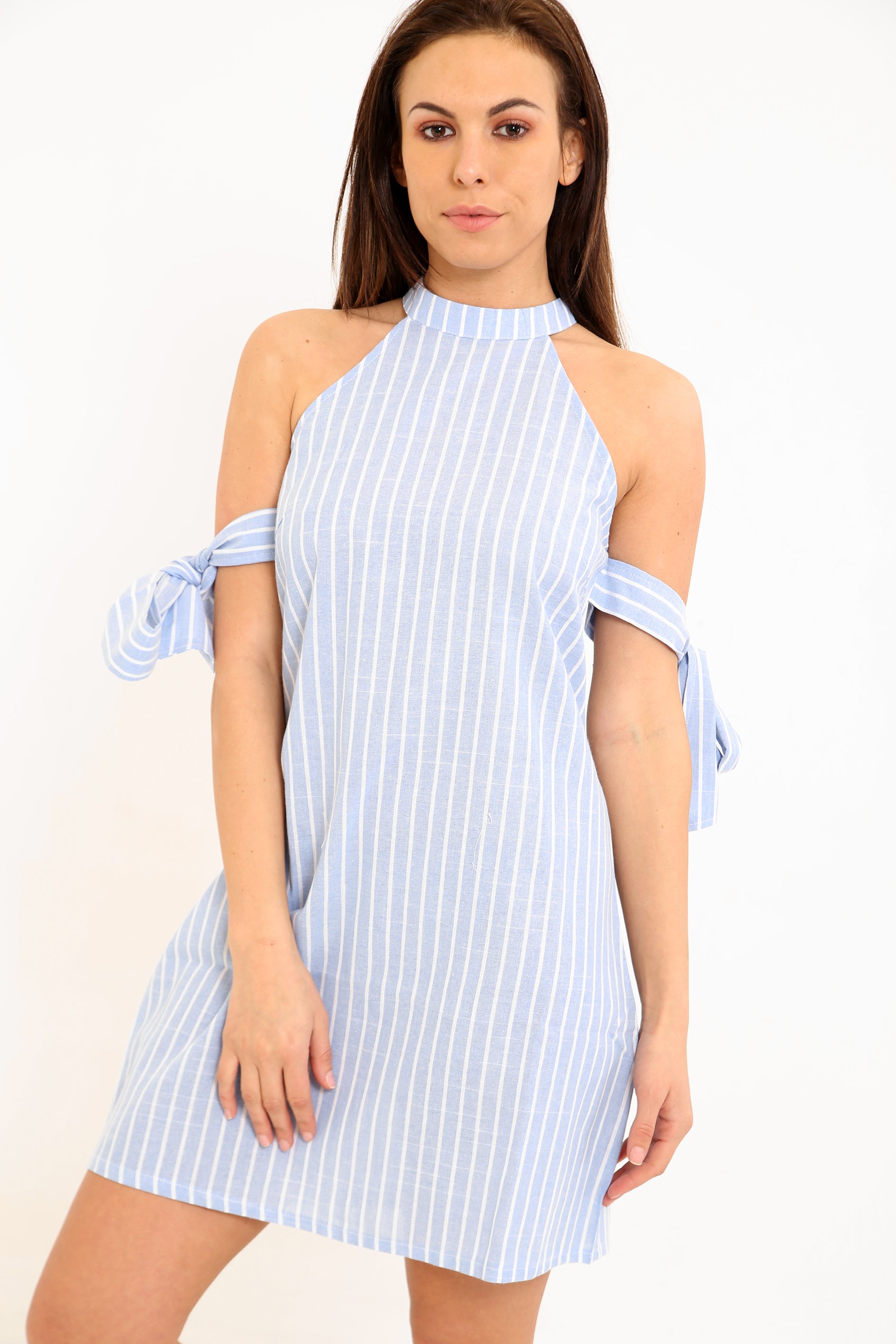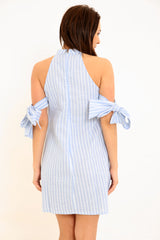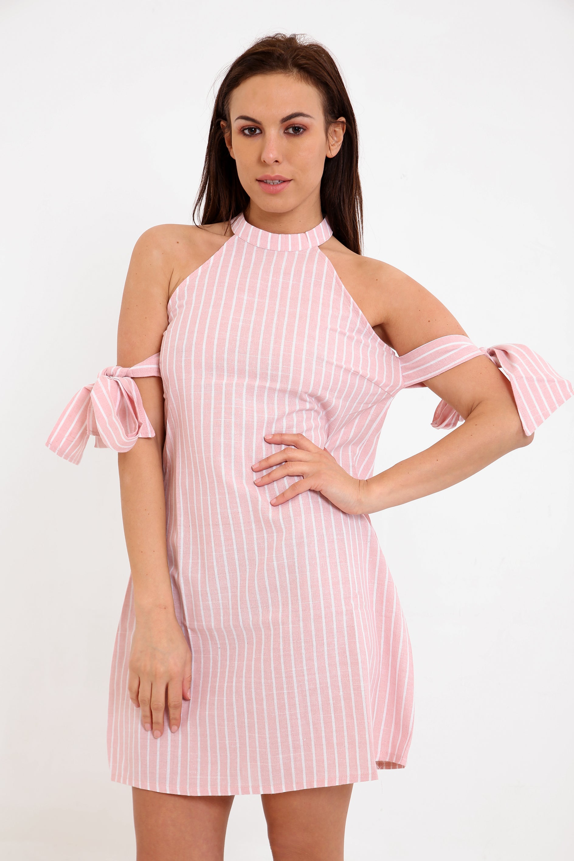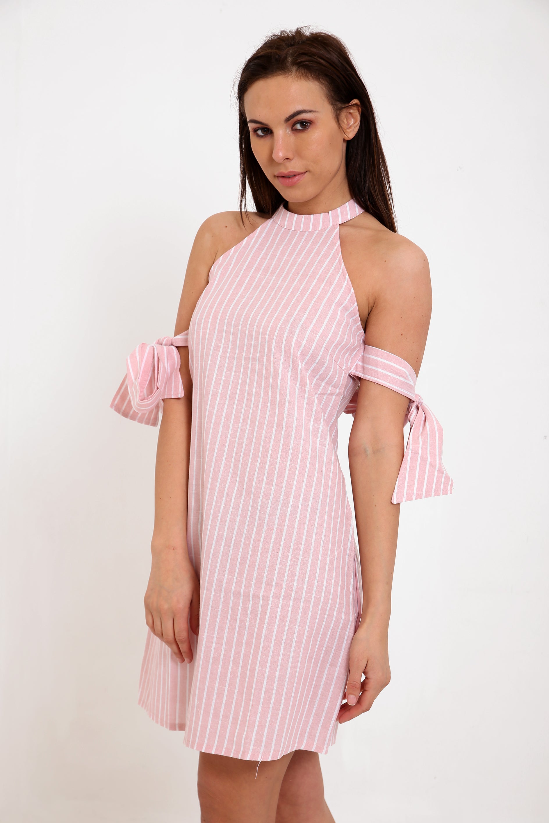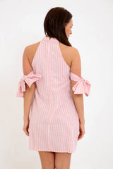 Vestido de lino de la corbata del brazo a rayas del cuello de gargantilla