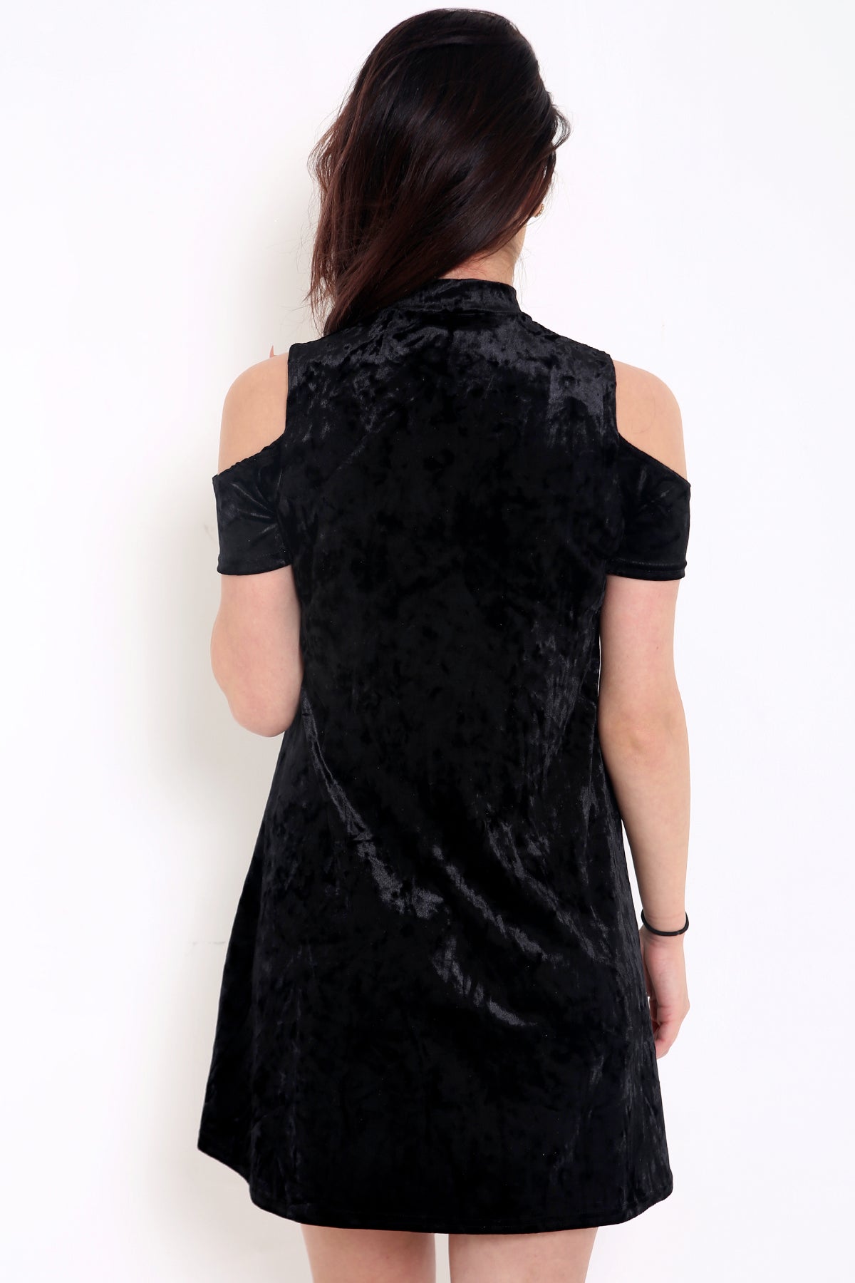 Crushed Velour Choker Neck Cold Shoulder Swing Dress