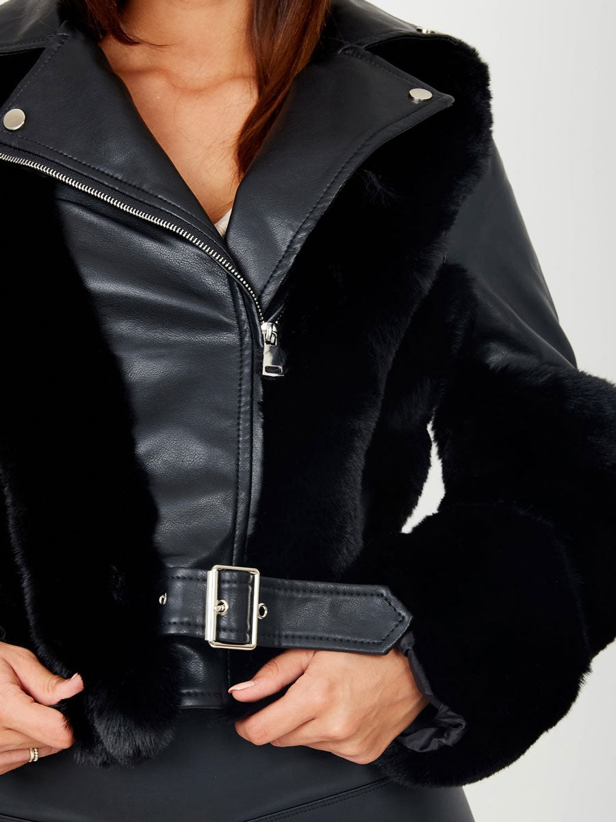 Faux Fur Panel Belted PU Jacket