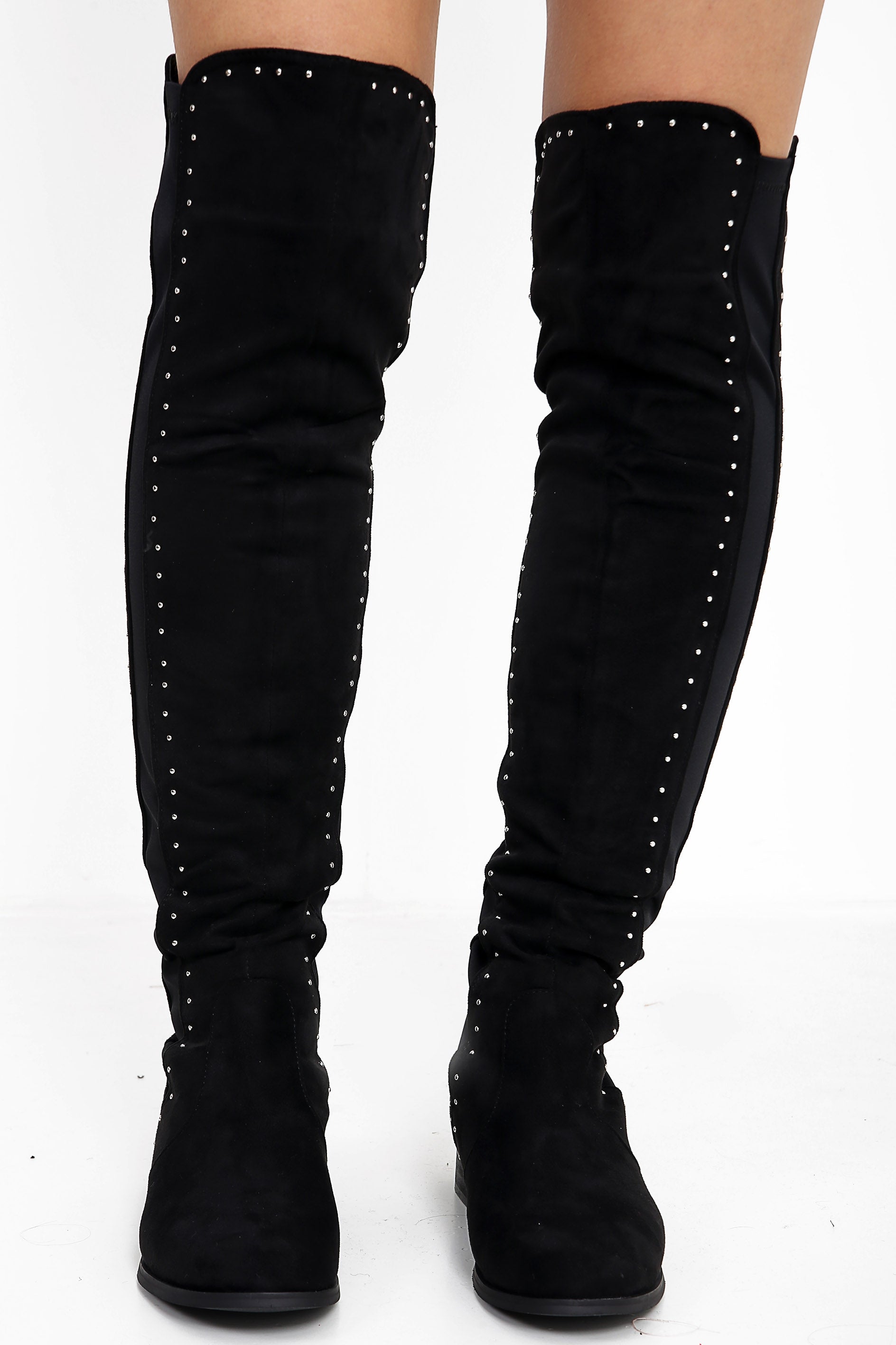 These boots channel some serious 70s vibes with its over the knee style, faux suede fabric with stretch and stud detail