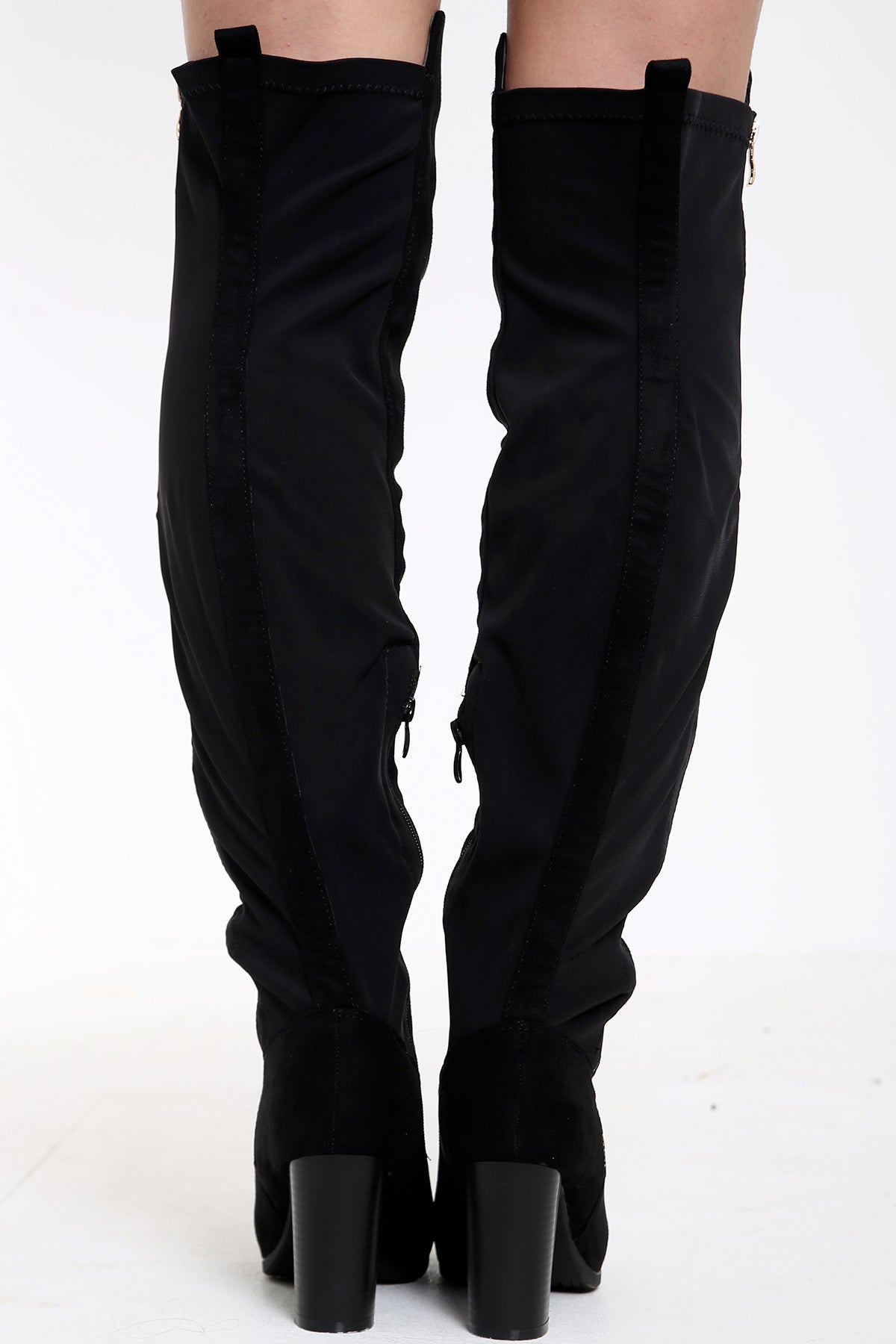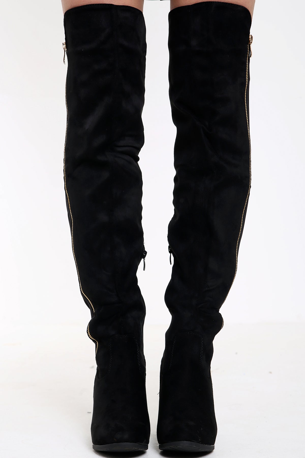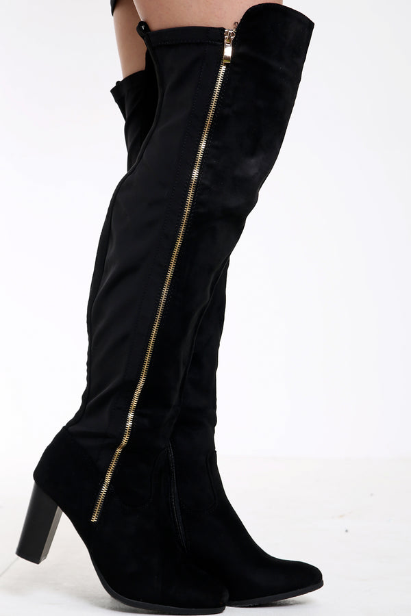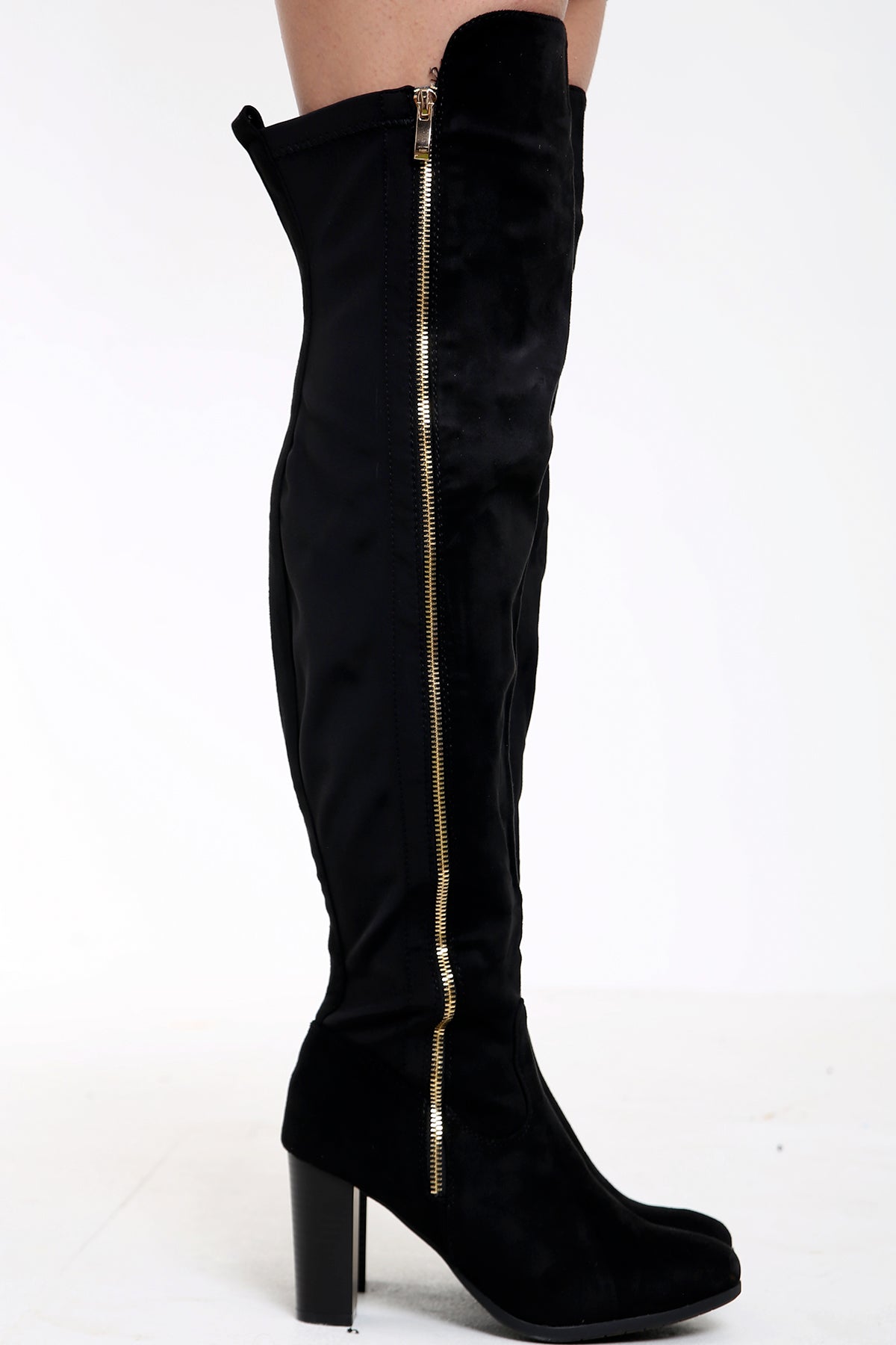 These boots channel some serious 70s vibes with its over the knee style, inner zip, faux suede fabric and its elasticated panel with zip up detail