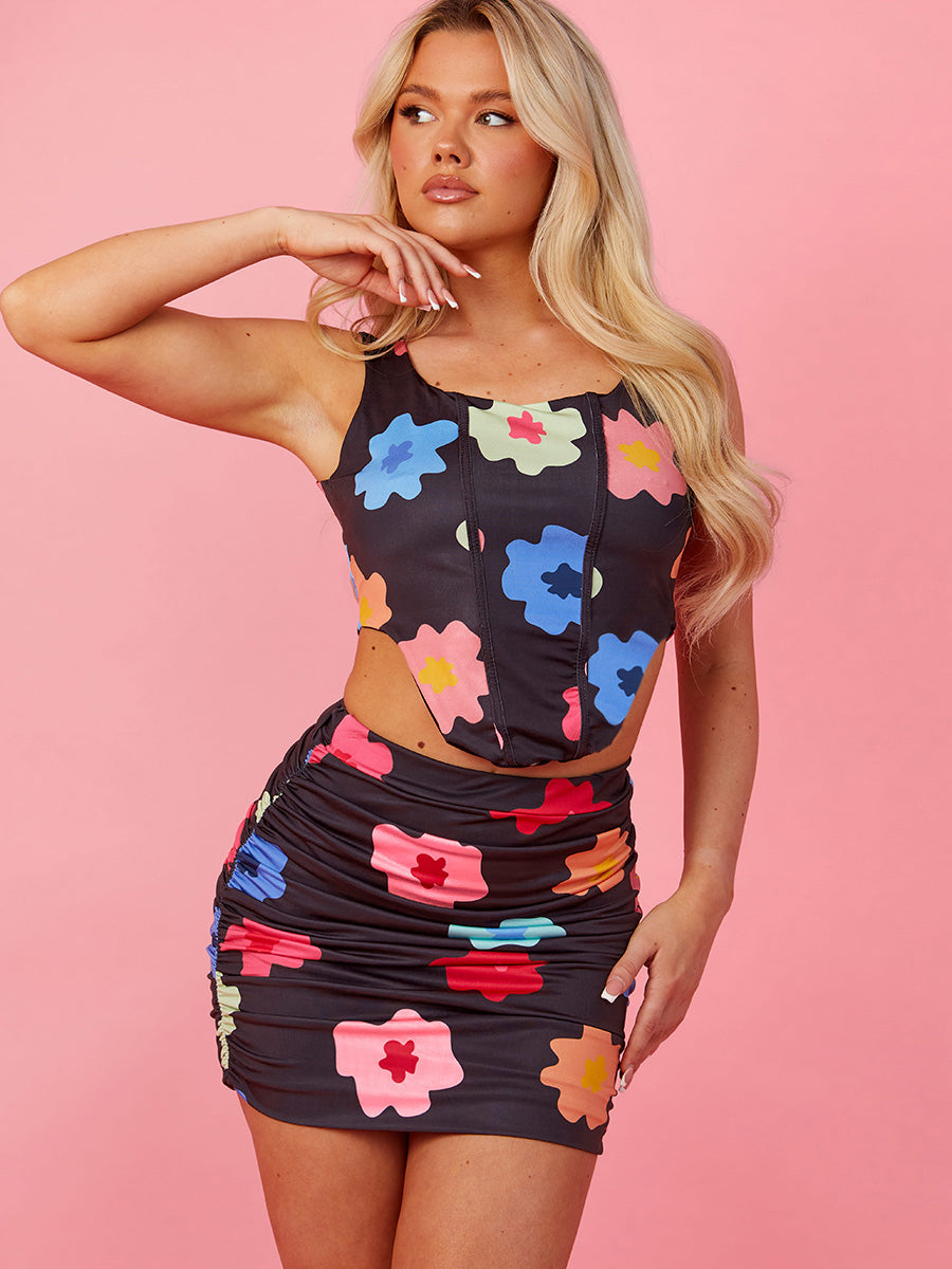 Floral Slinky Crop Top & Ruched Skirt Co-ord