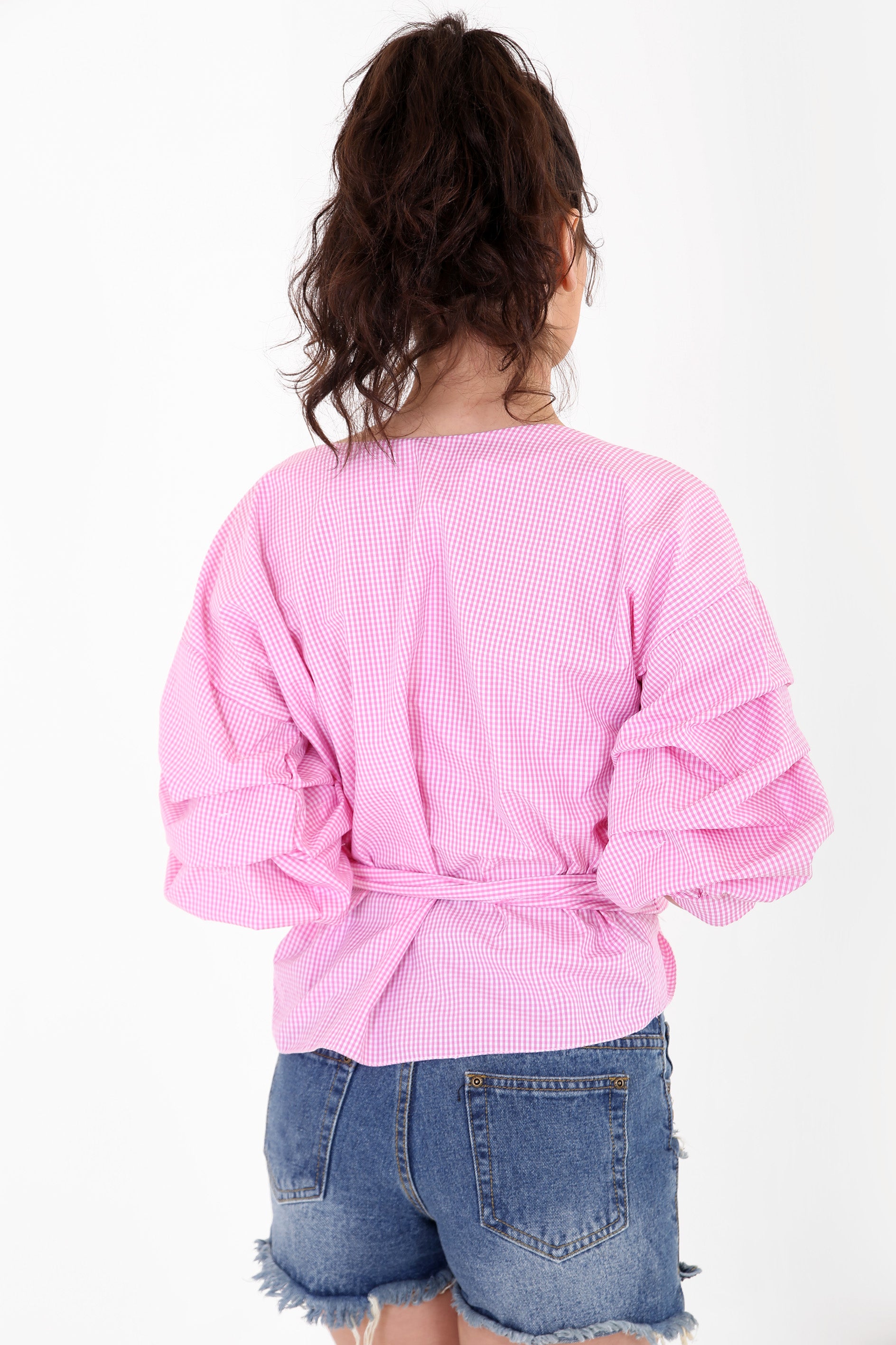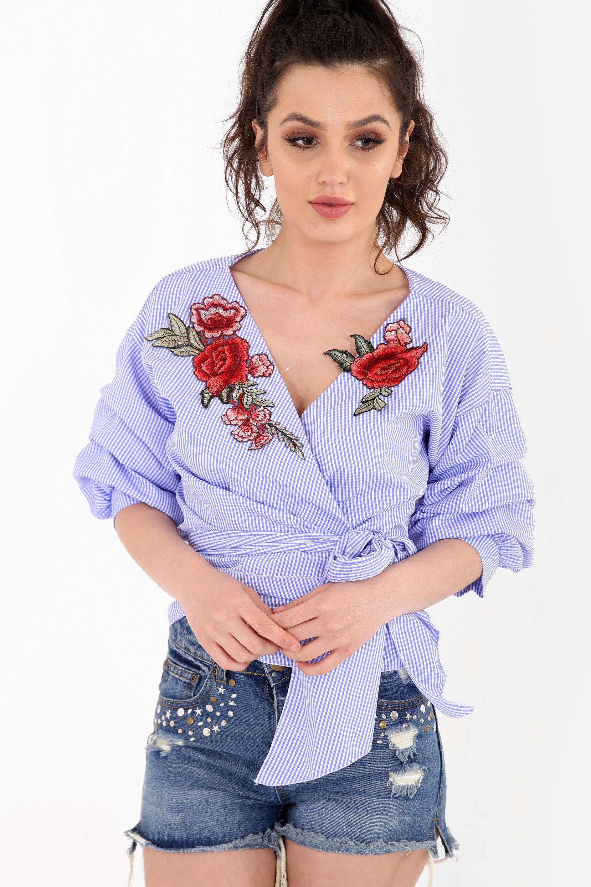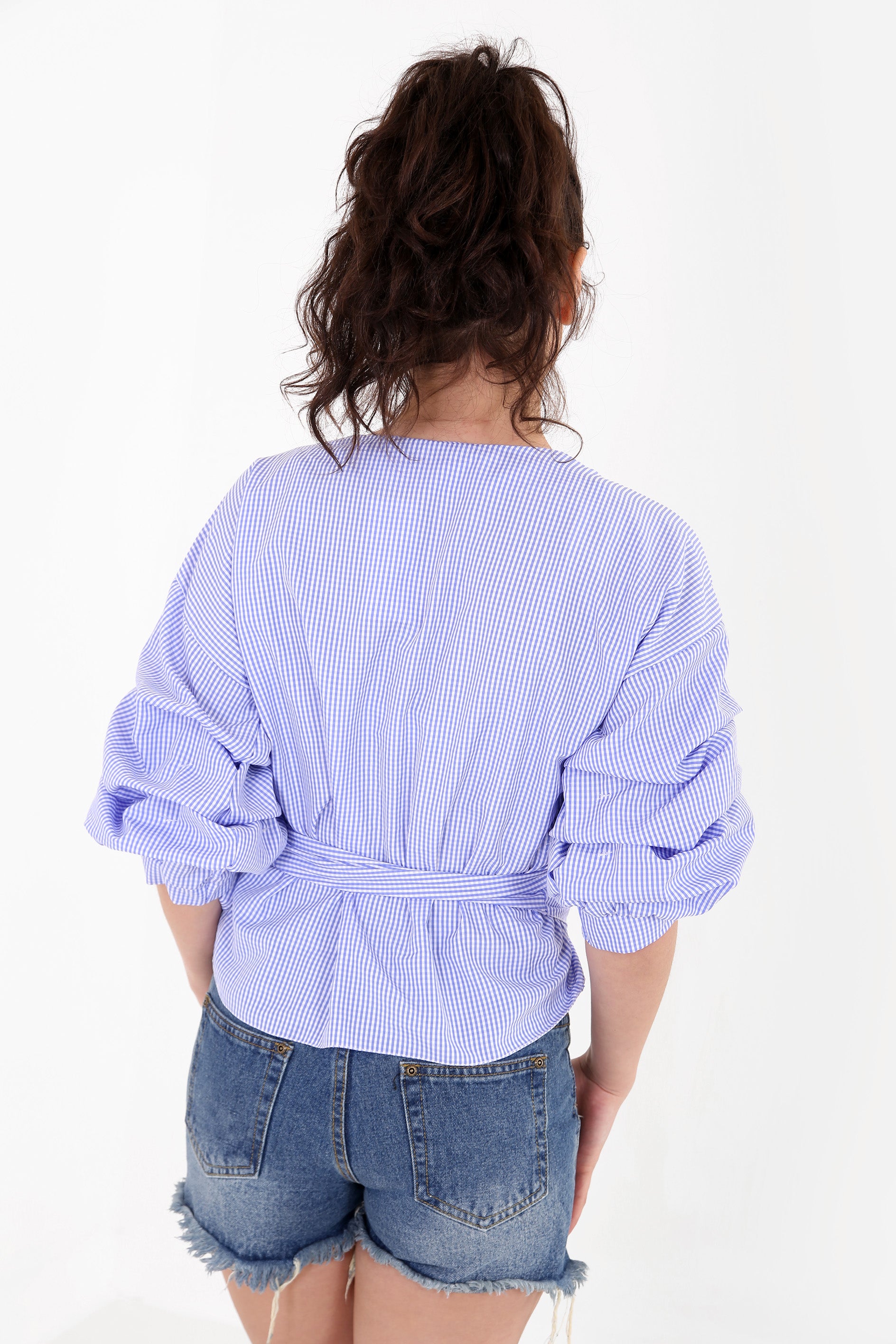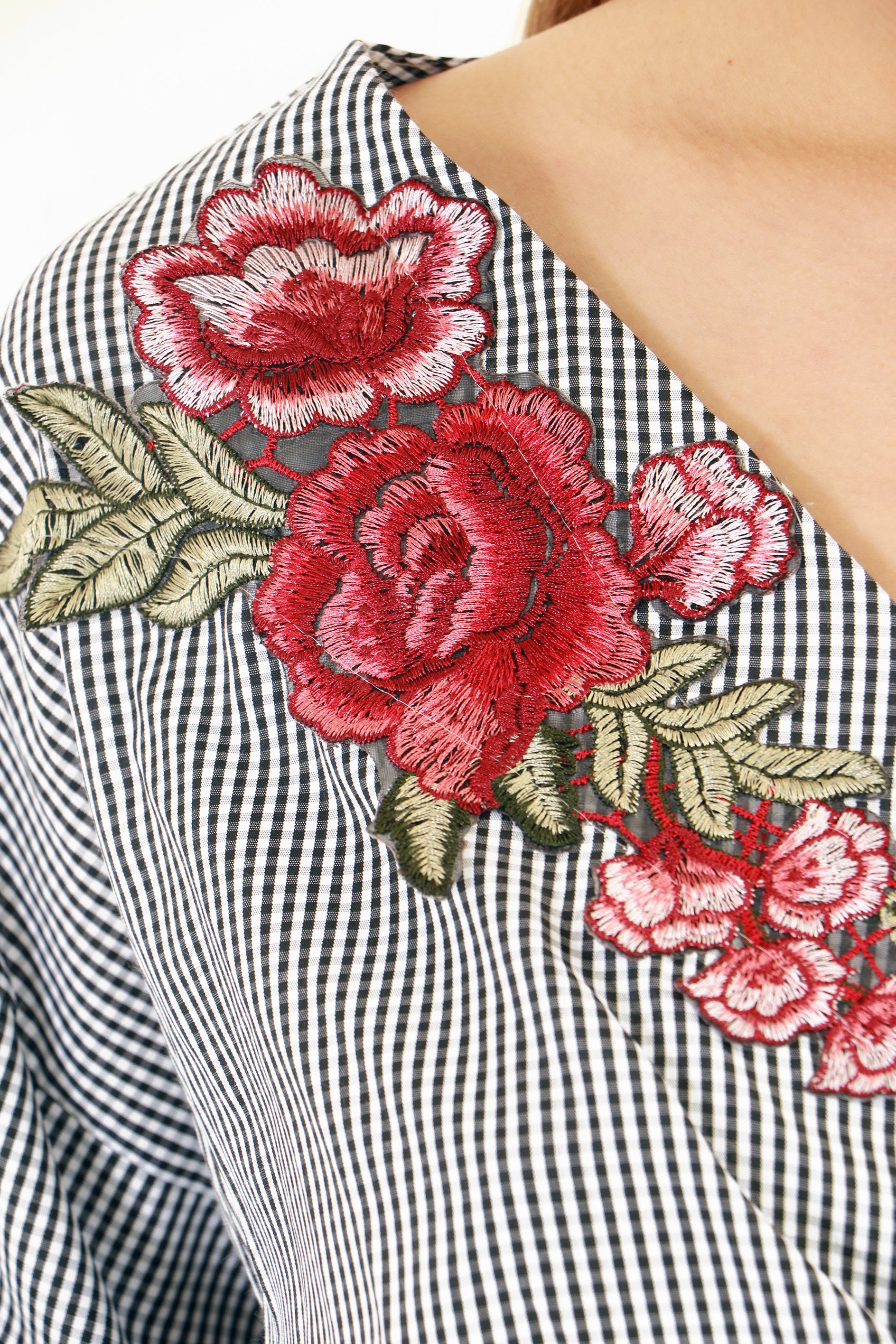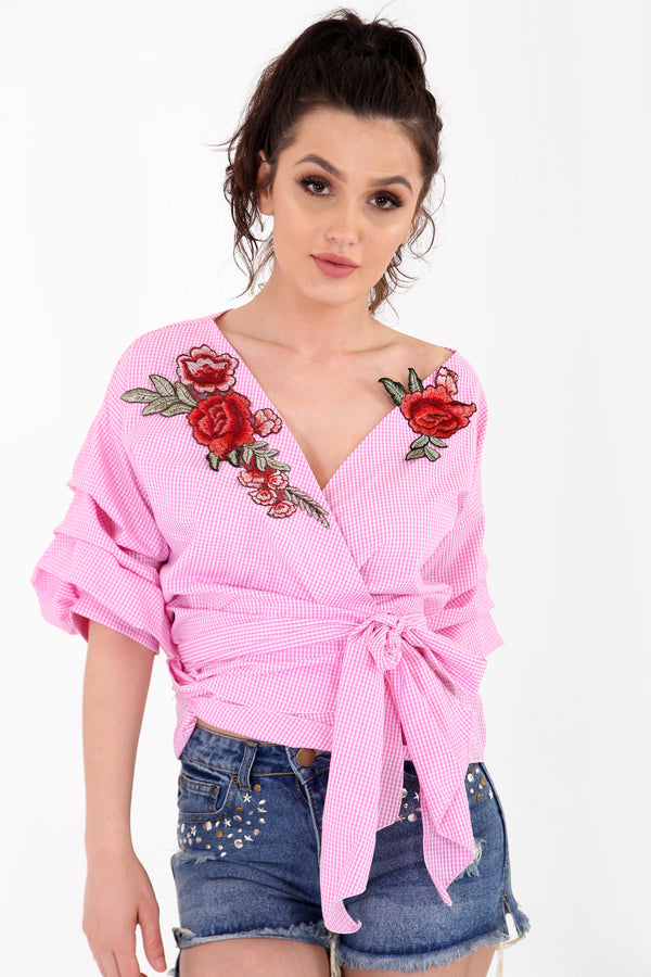 Gingham Check Wrap Over Embroidered Tie Knot Blouse Top