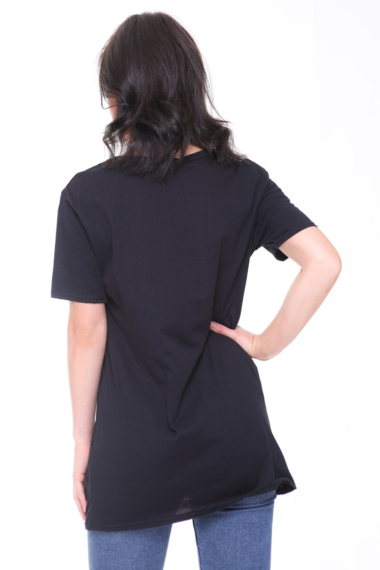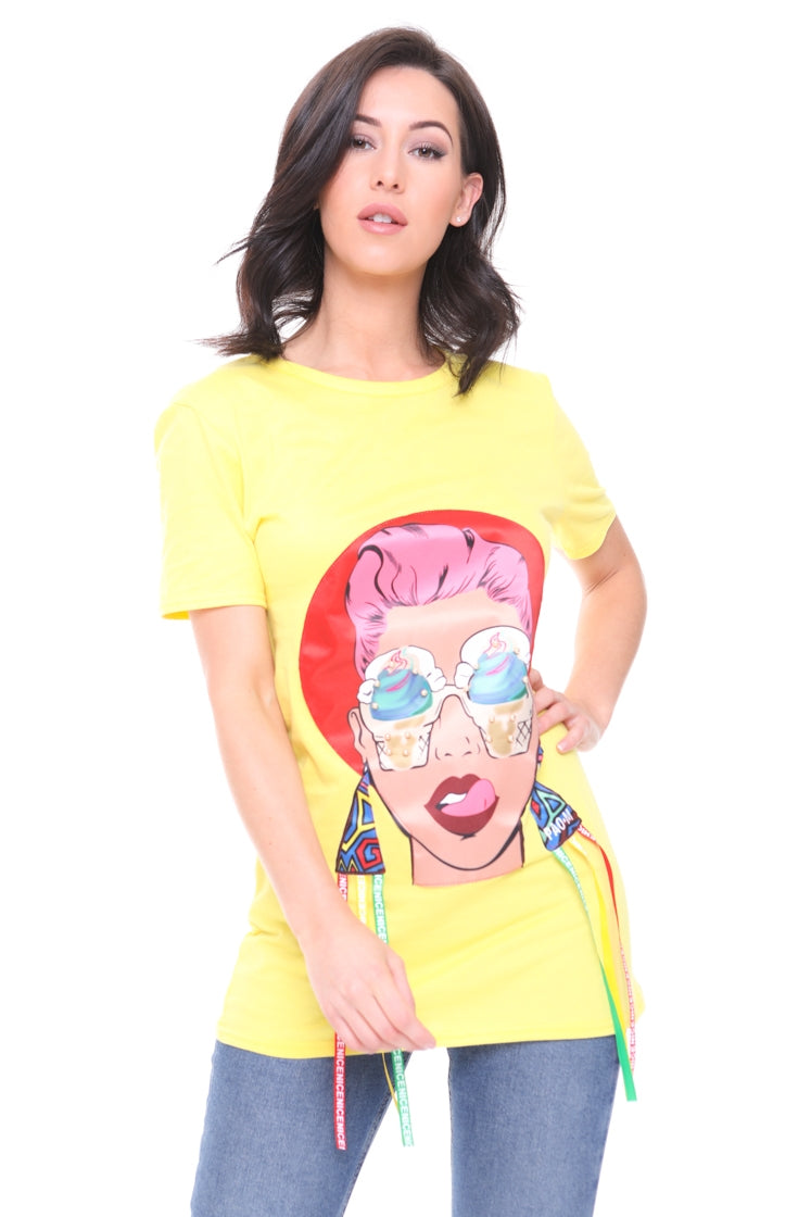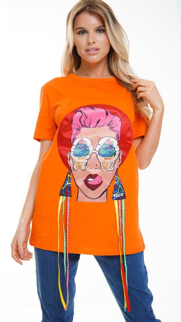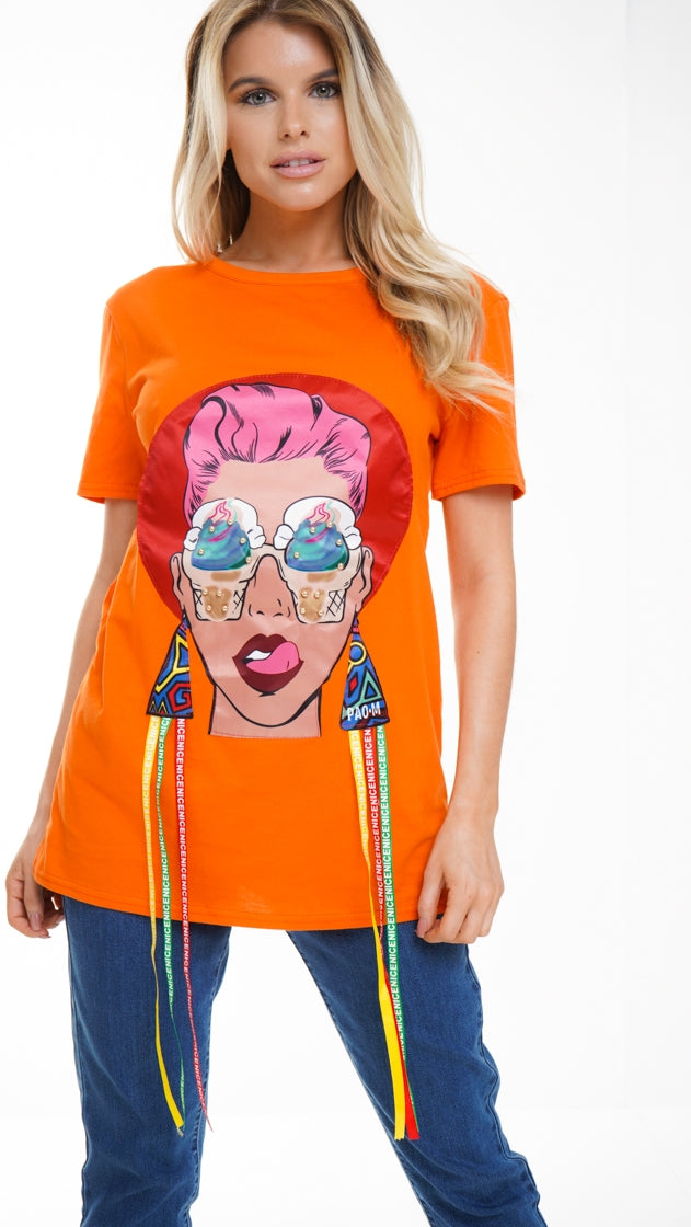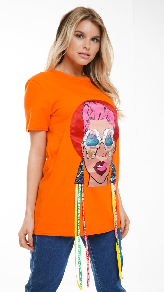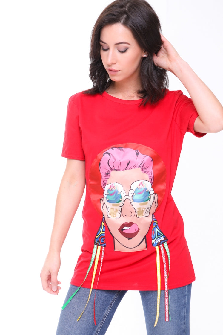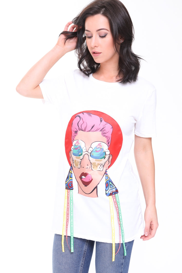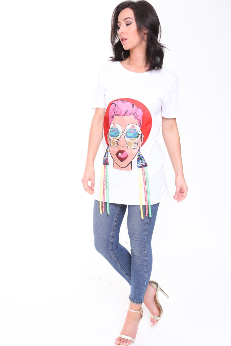 Longline Applique Girl Face T-Shirt With Tassels