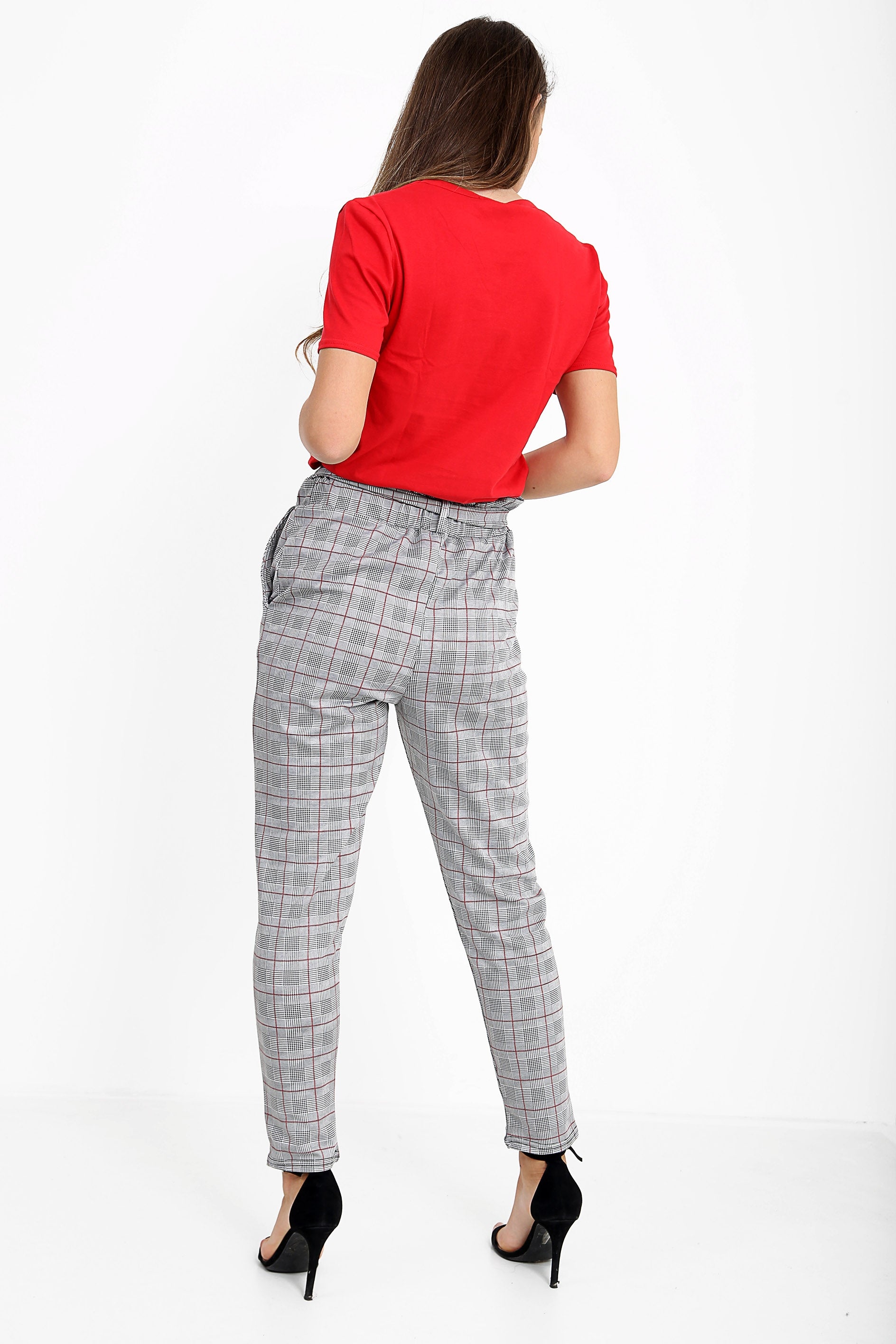 Multi Red Check Paper Bag Tie Waist Trousers
