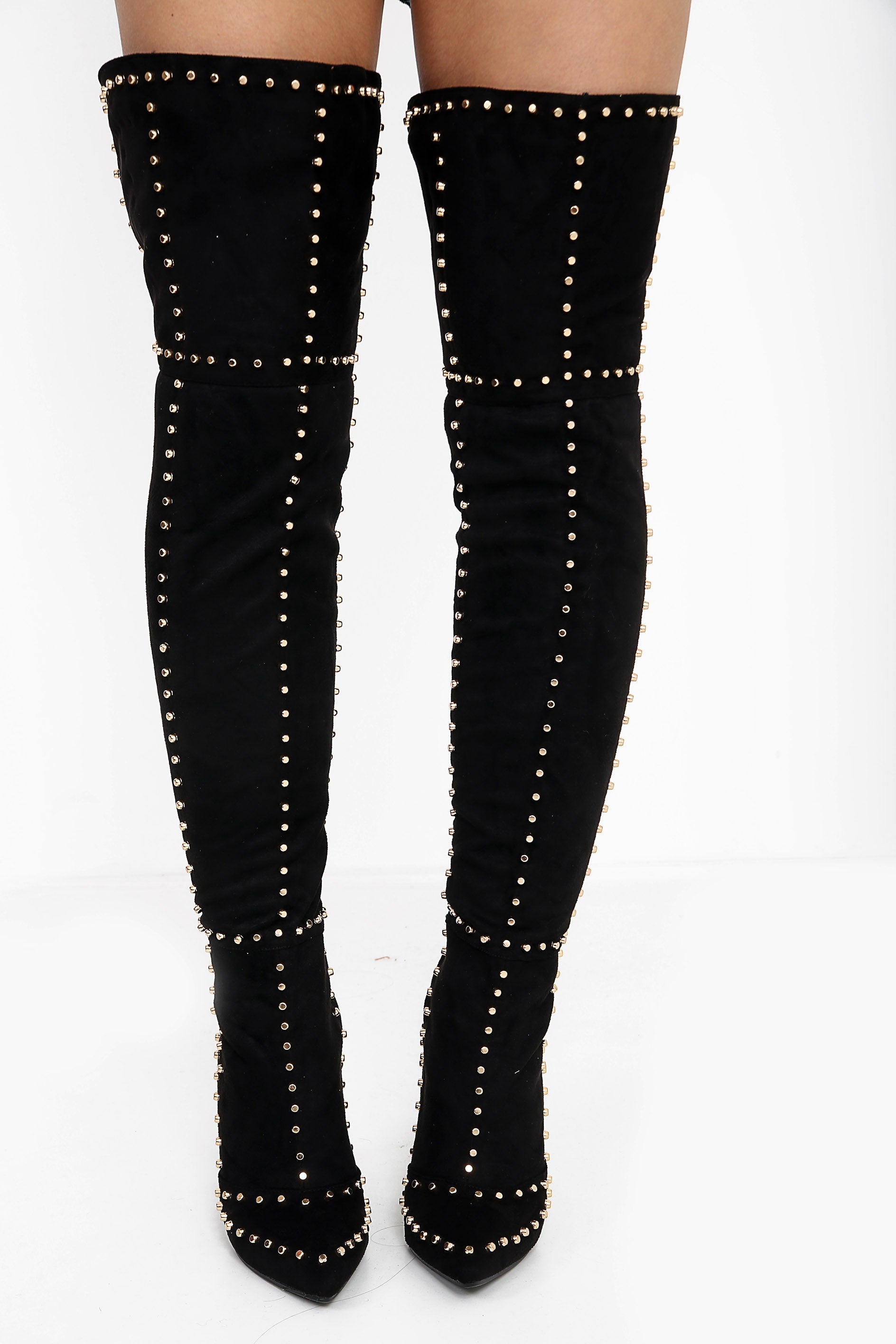 In a faux suede finish, gold stud embellishment, zip back, knee high style and pointed toe, these are one perfect pair