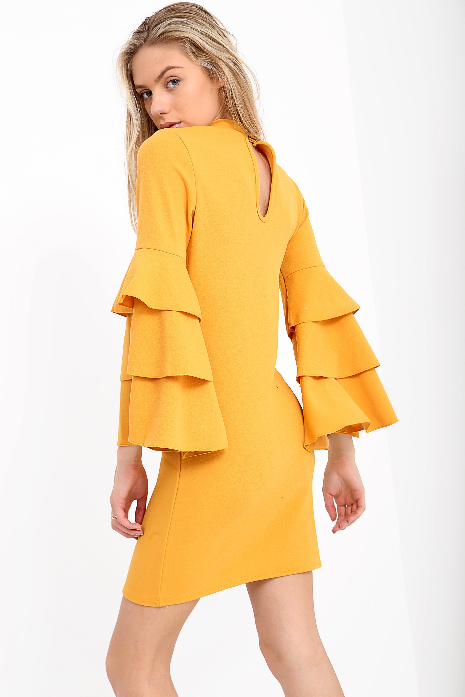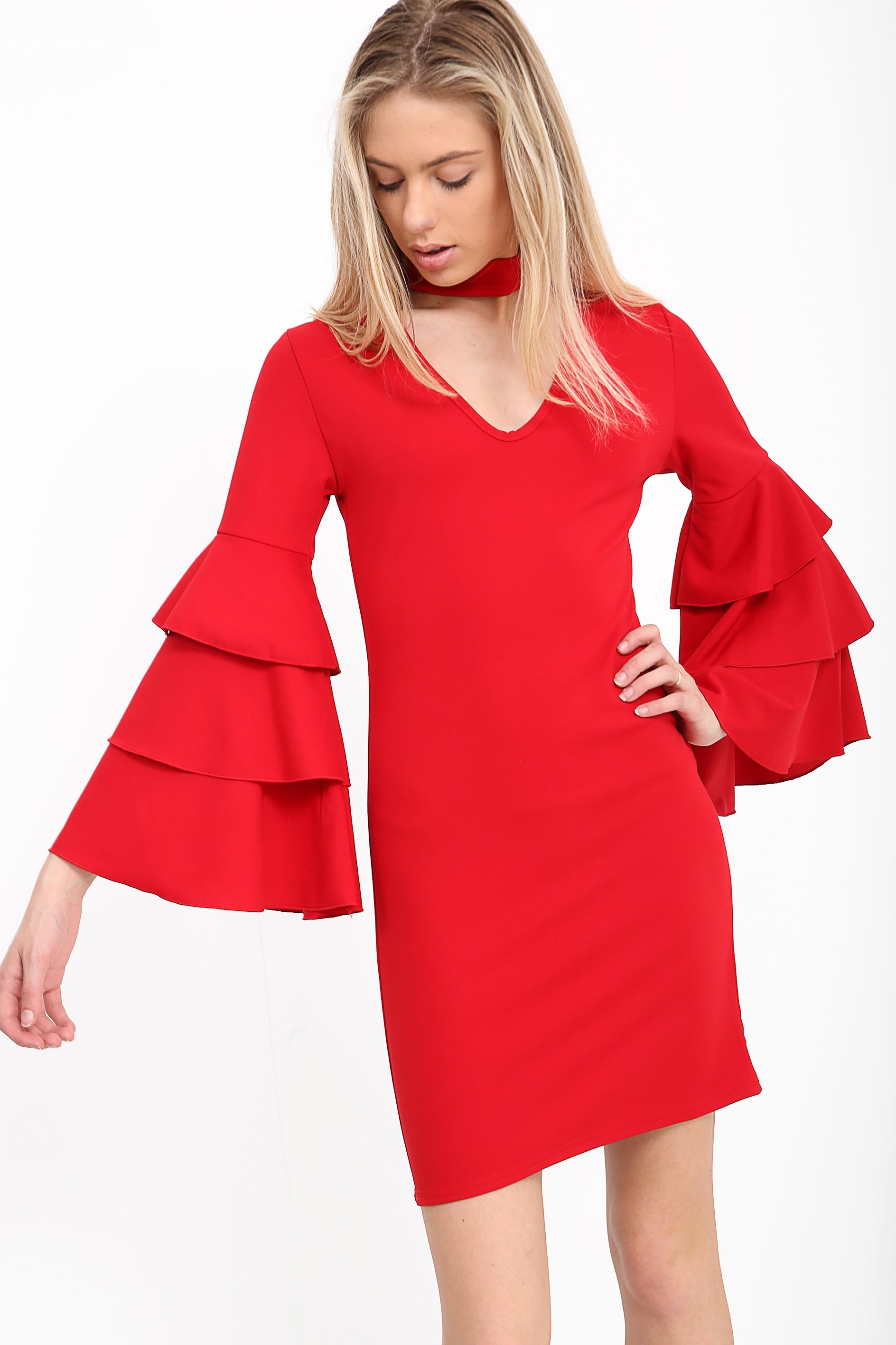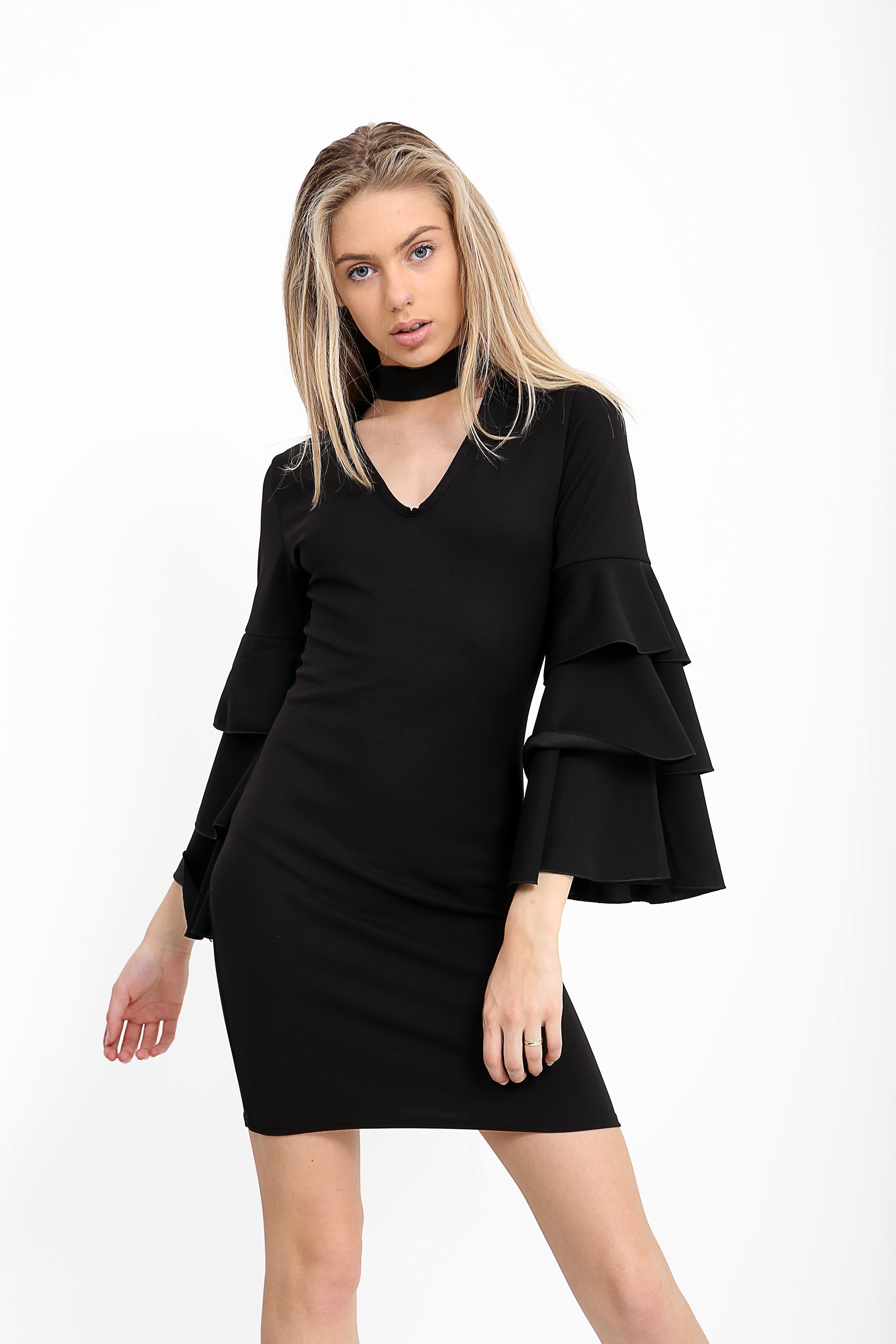 Triple Frill Sleeve Choker Neck Bodycon Dress
